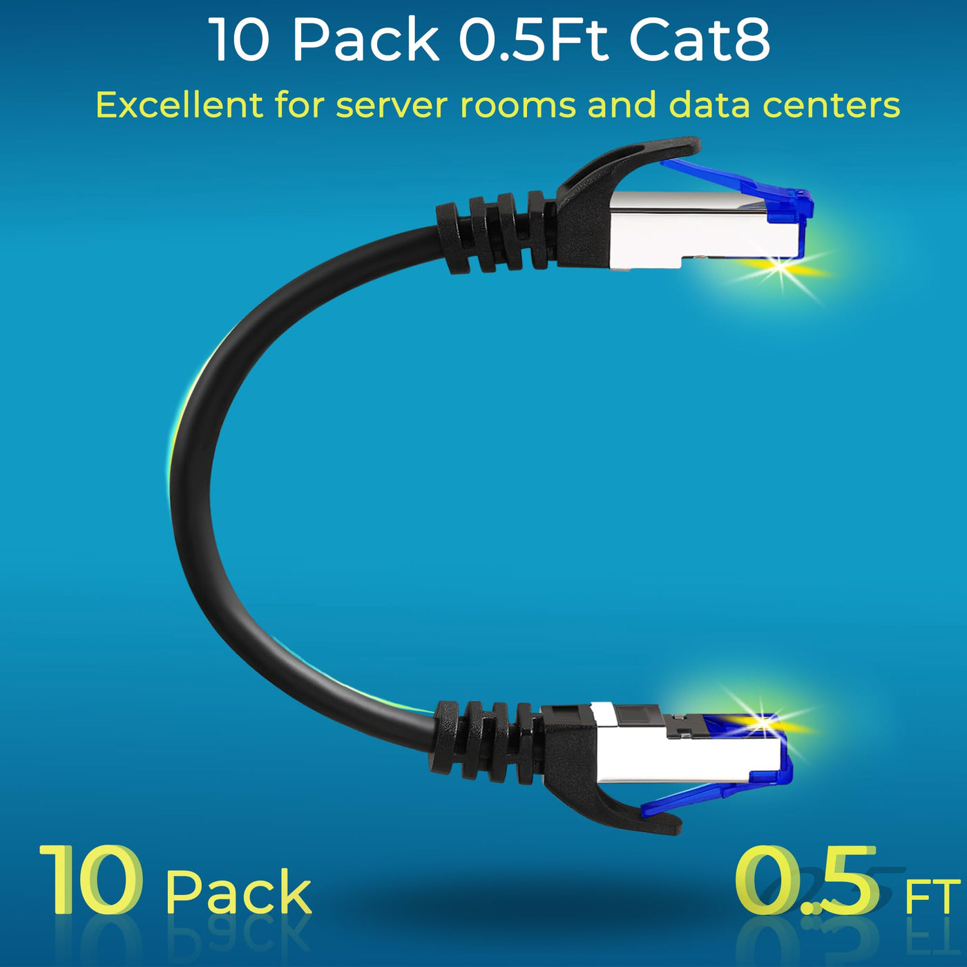 Rapink Patch Cables Cat8 0.5Ft (10 Pack) Slim, Cat 8 Ethernet Patch Cable 40G Support, Snagless Cat 8 Network Cable For Data Center, Flexiable Cat8 Ethernet Cables Black (10Pc830 0.5)
