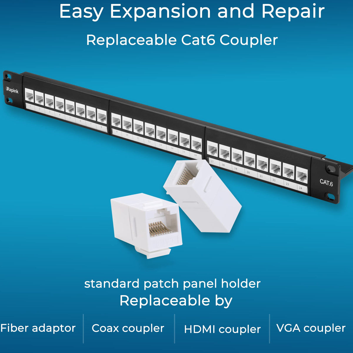 Q: Can I expand my network with this patch panel?A: Yes, the Rapink Patch Panel allows for easy expansion. You can replace the Cat6 coupler with other types, such as fiber adaptors or HDMI couplers, to accommodate future network needs.