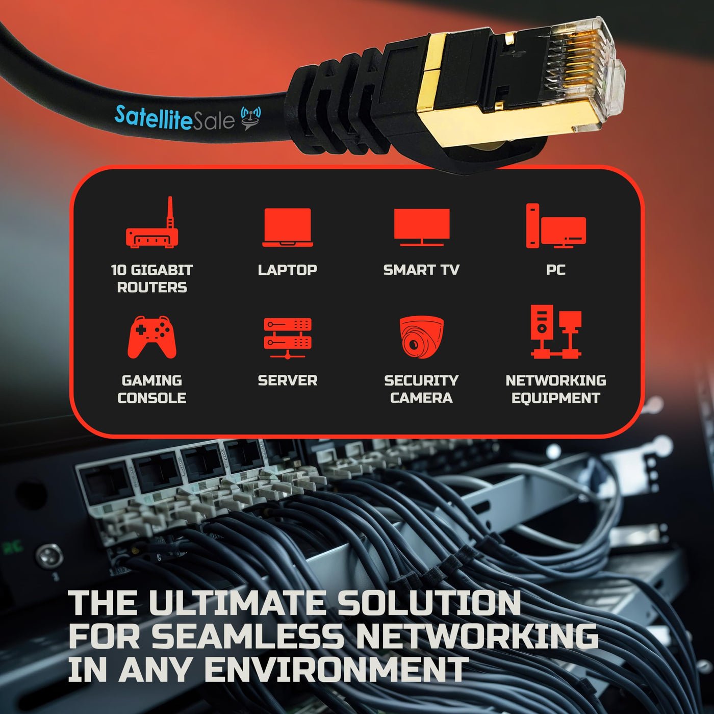 Satellitesale Rj45 Cat-7 High Speed Ethernet Cable 10 Gbps Universal Wire Black Cord Is The Best Type Of Ethernet Cat 7 Ethernet Cable That Can Be Easily Connected To All Of Your Devices. Enjoy High-Speed Data Transfer Both In Commercial And Residential Setups. We Offer Different Cat 7 Ethernet Cable Sizes, Starting With 3 Feet Long And Reaching Up To 50 Feet Long Cat 7 Ethernet Cable. Designed Specially To Support The Latest Equipment With The Highest Internet Speed Connection. Every Ethernet Cat-7 Patch Cord We Sell Is Covered With A Durable Pvc Jacket To Protect It From Unwanted Bending Damage And To Increase Its Durability. Moreover, Gold-Plated Connectors Will Resist Oxidation And Ensure A Longer Lifespan. Enjoy The Clarity Of The Sound And Picture Without Any Distortion And Signal Loss, Even At Extended Lengths.&Nbsp; Our Satellitesale Cat-7 Network Ethernet Patch Cable Is Compatible With The Modern And Previous Generation Of Devices Such As Gaming Consoles, Modems, Desktop, And Laptop Computers, Switches, Servers, Network Hubs, Routers, Printers, Adsl, Nas, And Voip Phones. Ideal To Use With Smart Tvs. We Assure The Lifetime Service Of Each Patch Cat 7 Ethernet Cable To Deliver A Positive Experience To Our Clients.&Nbsp; &Nbsp;