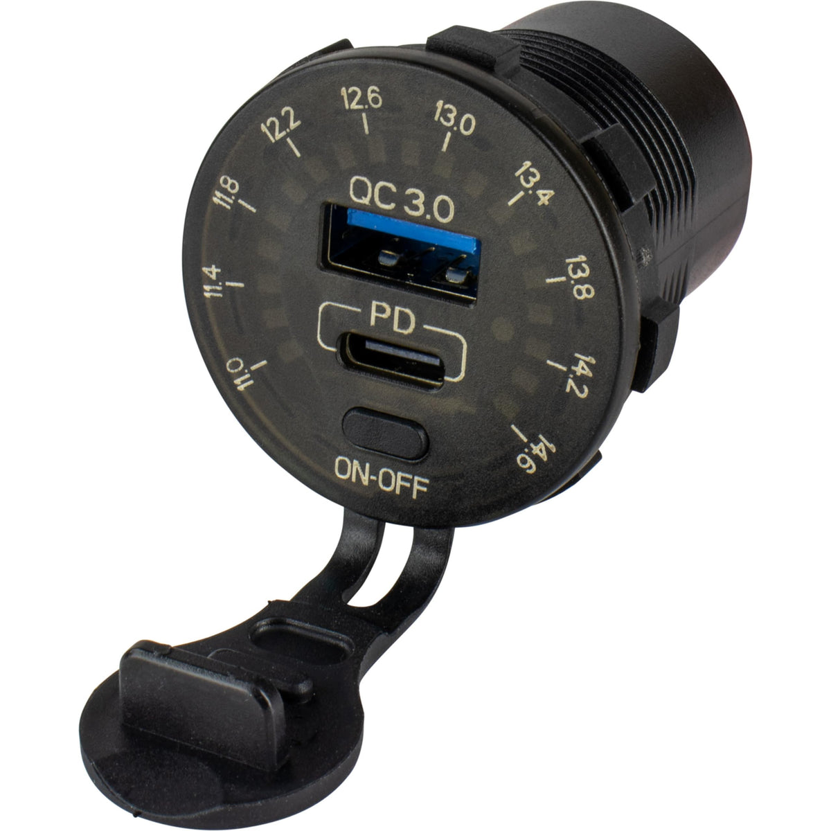 strongRound Rainbow Voltmeter with USB & USB-C Power Socket/strongRainbow Volt Meter with USB 3.0 & USB-C Power Socket charges two devices simultaneously while the rainbow dial displays voltage status. The total output 6A load is split 3A per side as needed. USB 3.0 features Quick Charging (QC) for supported devices, giving enough power to charge phones, pads, and tablets quickly and efficiently. USB-C features Power Delivery (PD) for faster and more flexible charging. A protective dust cap extends the life of the charger. The rainbow display gives the user quick, visual, color-coded voltage information.  Includes an On/Off button to conserve battery power when not needed. strongFeatures: strongulliRed/orange means the voltage is too low liliGreen means voltage is normal liliRainbow volt meter reads voltage up to 14.6 volts/liliConstructed of injection molded nylon liliInstallation is as easy as drilling a 1-1/8&rdquo hole, inserting the socket body, tightening the locking nut, and connecting the wires liliAlso, fits Sea-Dog® Power Socket Shell (426100) and Mounting Bracket (426105)/lili RoHS compliant & IP65 rating/li/ulstrongSpecificationsstrongulliOutput DC: 5V/6A/liliInput: 8-32VDC/liliUSB-C Watts: 60W@24V liliUSB Watts: 36W@12V/liliPlug-In Side Diameter: (inch) 1-7/16''/liliLength: (inch) 1-1/2''/li/ul*Sold as an Individual !