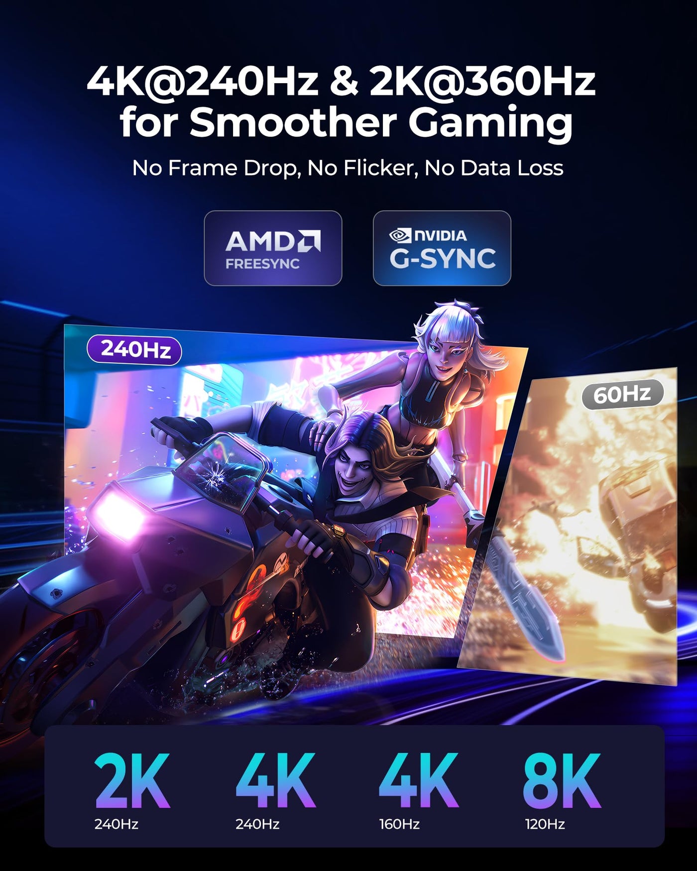 Q: What features enhance the gaming experience with this cable?A: The cable supports G-Sync, FreeSync, and DSC 1.2a technologies, providing a smooth and responsive gaming experience with minimal lag and enhanced visual quality.