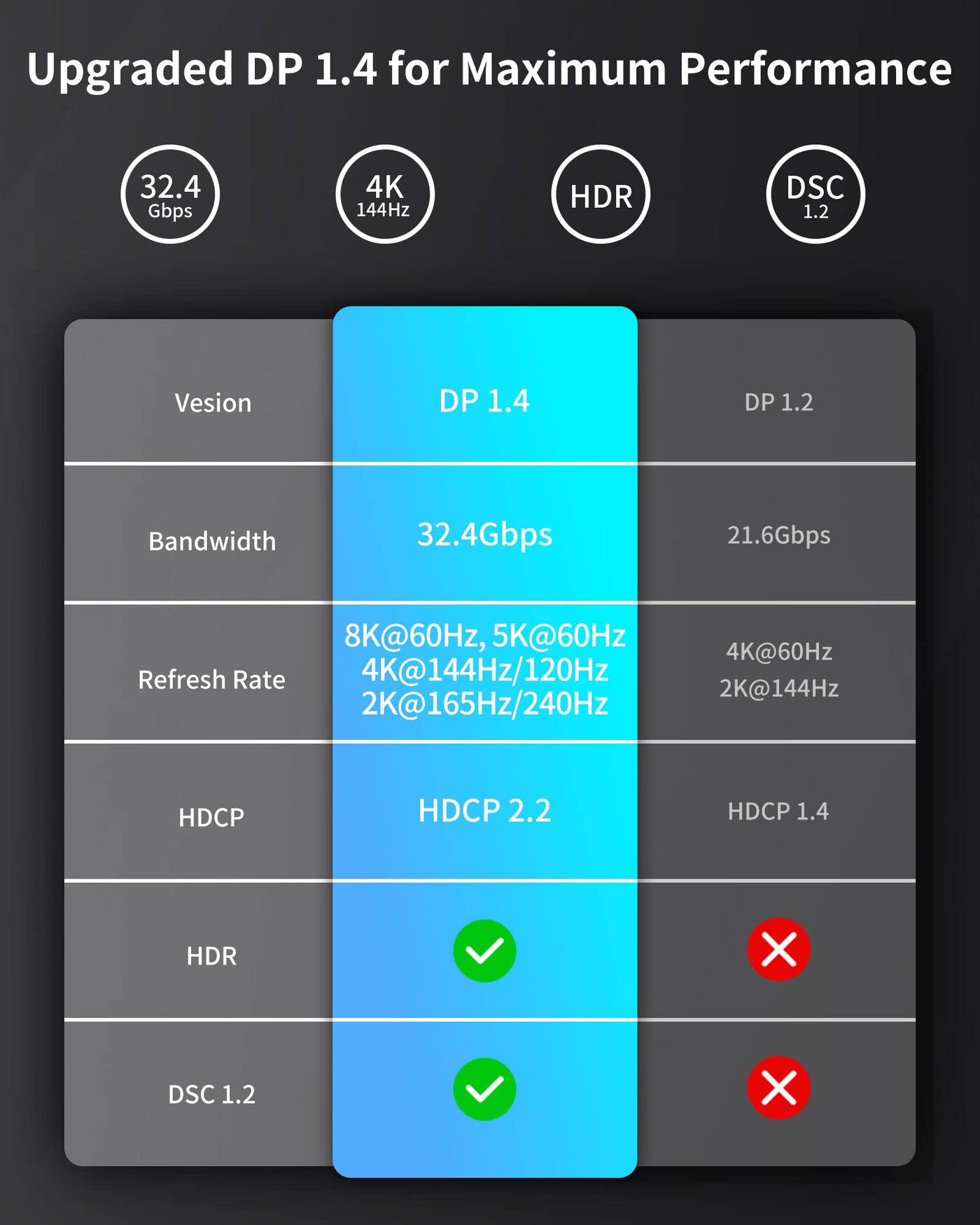 Mini Displayport To Displayport 1.4 Cable 3.3Ft 1M Support 8K@60Hz, 5K@60Hz, 4K@144Hz,4K@120Hz, 2K@240Hz Bandwidth: 32.4 Gbps (Hbr 3) Video: Hdr10, Dolby Vision, Hdcp 2.2, 10-Bit Deep Color,3D Audio: Dolby Atmos, 32 Audio Channels Gaming G-Sync, Freesync, Dsc 1.2, Fsc, Vrr
