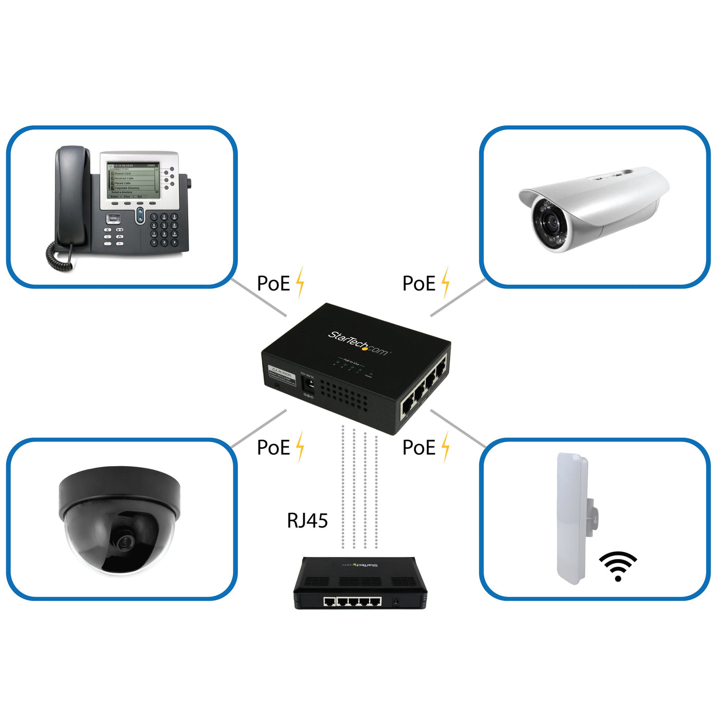 Brand Startech, Model Poeinj4G Type Poe Injector, Color Black, Industry Standards: Ieee 8023Af Poe, Ieee 8023At Poe+, Ieee 8023 10Base-T, Ieee 8023U 100Base-Tx, Ieee 8023Ab 1000Base-T, Ports: 4, Maximum Cable Length: 328 Ft 100 M], Maximum Data Transfer Rate: 2 Gbps (Full-Duplex), Mtbf: 50,000 Hours, Power Output: 52V Dc At 308W (Poe+), Connector Type(S): 8 - Rj-45 Female, Enclosure Type: Steel, Led Indicators: 1-Power, 4-Poe In-Use, Center Tip Polarity: Positive, Input Current: 2-1 A, Input Voltage: 100 240 Ac, Output Current: 231 A, Output Voltage: 52 Dc, Plug Type: M, Power Consumption: 120 W Max, Power Source: Ac Adapter Included, Included In Package: 1 - 4 Port Gigabit Poe+ Injector, 1 - Universal Power Adapter, 3 - Power Cords (Naukeu), 1 - Instruction Manual,