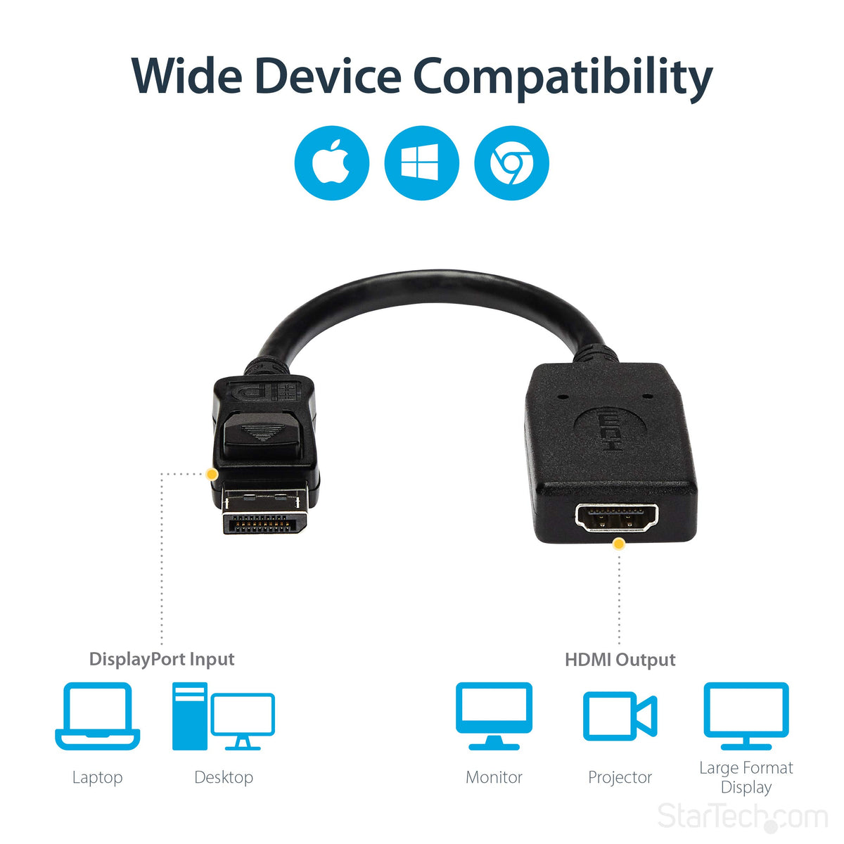Q: What devices are compatible with the StarTech DisplayPort to HDMI Adapter?A: The StarTech DisplayPort to HDMI Adapter is compatible with any device that has a DisplayPort output, including desktops, laptops, workstations, and small form factor computers using AMD or Nvidia video cards. It supports DP++ connections and works seamlessly with HDMI-enabled displays.