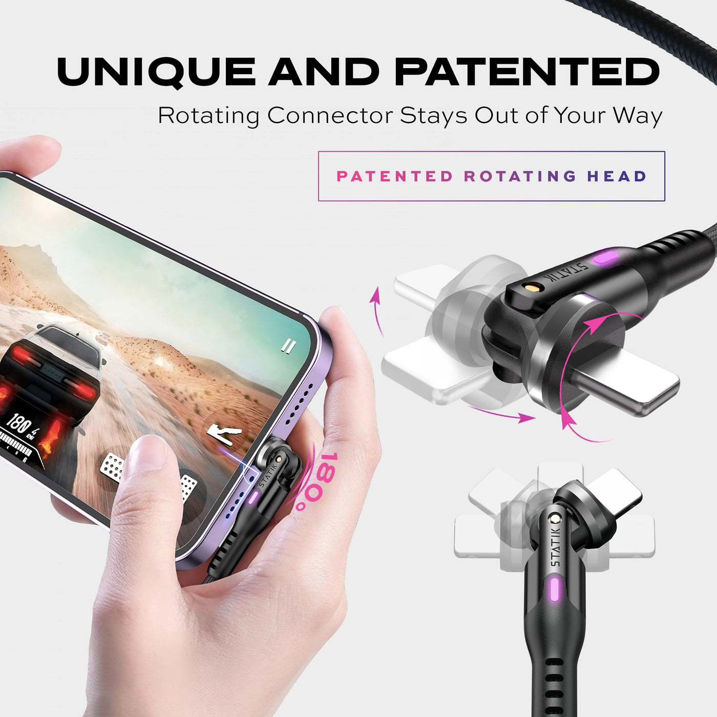 Statik Powerpivot 12W Usb To Iphone Compatible Charging Cable Right Angle Cable With 360 Degree Rotating Head, 90 Degree Swive
