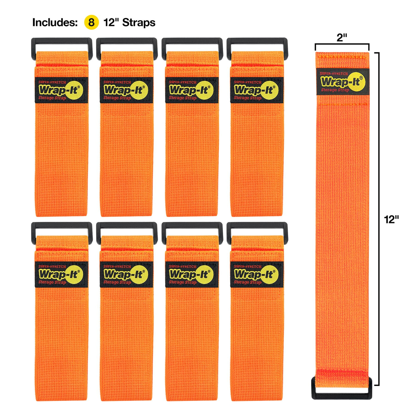 Super Stretch Wrap It Storage Straps (8) 12'' Orange Elastic Hook And Loop Cinch Straps Extension Cord Organizer, Hose And