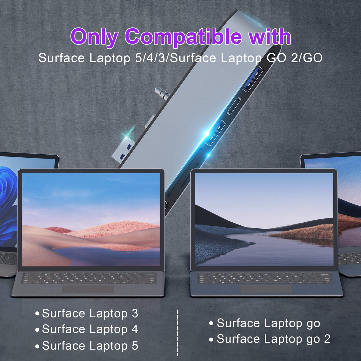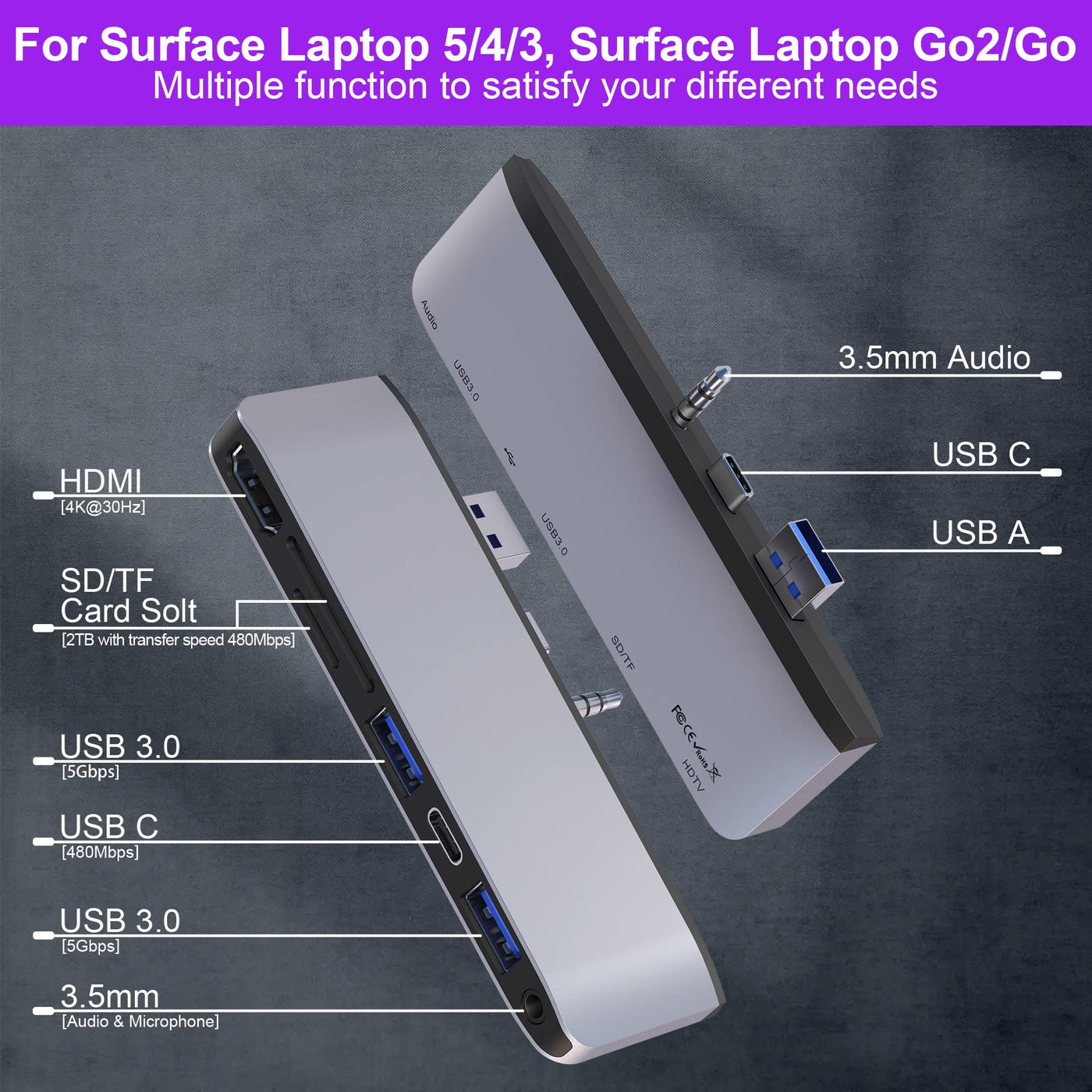 Product Specificationsinput:Usb-A + Usb-C + 3.5 Mm Audio Portoutput:4K Hdmi Port X1 (4K@30Hz)Usb 3.0 Port X2 (5Gbps)Usb C 2.0 Port X1 (480Mbps)Sd Card Slot X1 (480Mbps)Tf Card Slot X1 (480Mbps)3.5 Mm Audio Port X1Hdmi 4K High Resolutionthe 4K Hdmi Port Allows You To Output 4K@30Hz Resolution Video And Images To An External Display On A Large Screen By Simply Connecting This Product To Your Hdtv, Monitor, Projector Or Display.High Speed Data Transfer2* Usb 3.0 Port: 5Gbps Data Transfer Rate Allows You To Transfer Hd Video In Seconds, While Surface Laptop 4 Usb Hub Allows You To Connect Usb Peripherals Such As Usb Memory, Mouse And Keyboard.The Type C Port Allows Data Transfer Speeds Up To 480 Mbps. (Does Not Support Charging And Video Output)Tf And Sd Card Slotsd Cards: Sdxc, Sdhc, Sd, Mmc, Rs-Mmcmicro Sd Cards: Micro Sd, Tf, Micro Sdxc, Micro Sdhcuhs-I Memory Cards, Support Up To 2T Capacity Cards.Note: This Surface Laptop Hub Not Support Read And Write Sd/Tf Cards At The Same Time.3.5 Mm Audio Portthis Surface Laptop 5 Hub Features A 3.5Mm Audio And Microphone Output Port For Easy Listening.Please Note: Because The Surface Laptop Dock Plugs In To The Headphone Jack, The External Speakers Are Disabled, Audio Is Limited To Headphones Only, You Can Disabling Headphone Output, Then You Can Use External Speakers.Excellent Heat Dissipationsurface Laptop Go Docking Designed With Aluminum Alloy, The Heat From The Internal Chip Is More Rapidly Distributed To The Outside Through The Aluminum Alloy Casing, Enabling Rapid Cooling Of The Chip Temperature.Compatible Modelssurface Laptop Go2Surface Laptop Gosurface Laptop 5Surface Laptop 4Surface Laptop 3