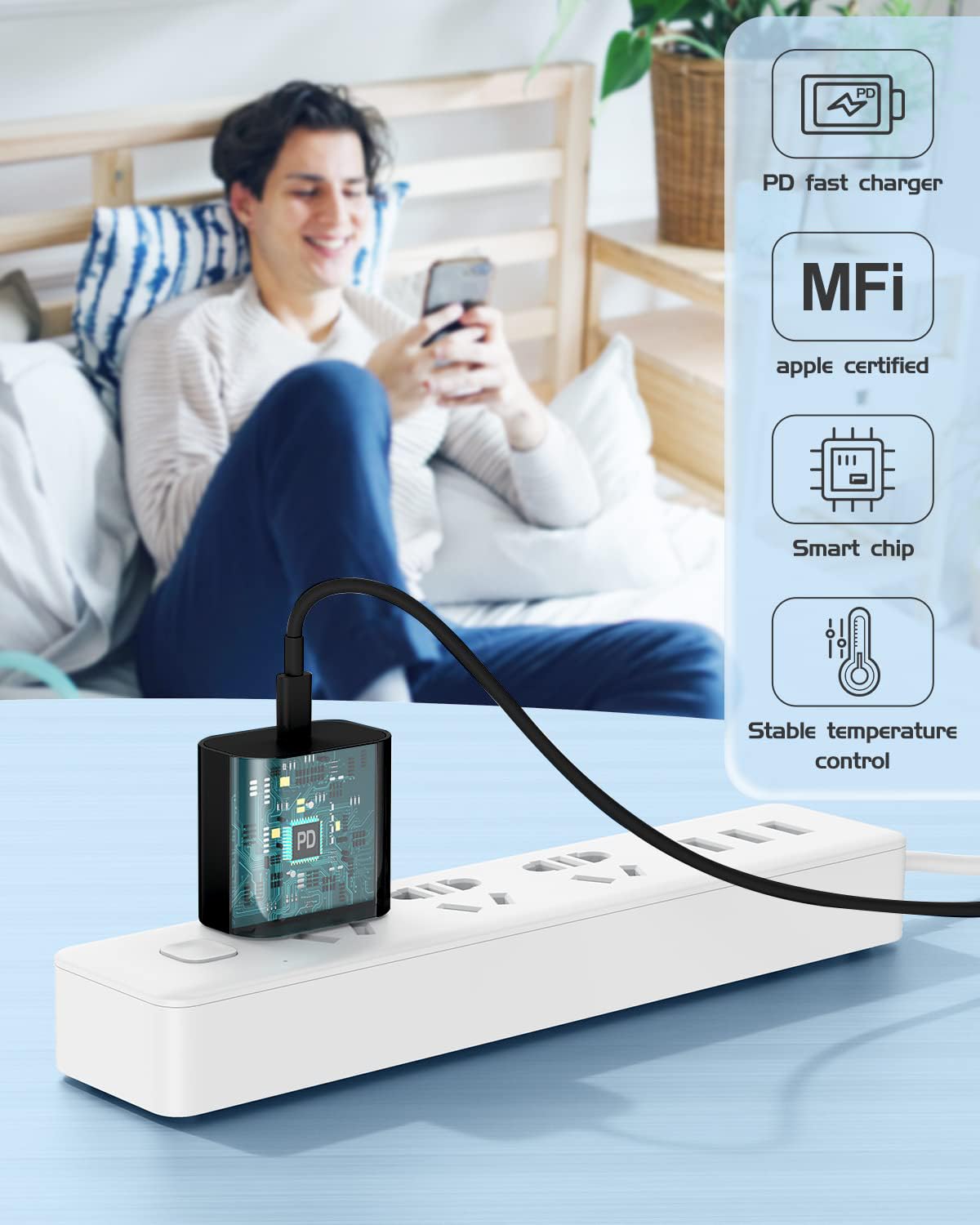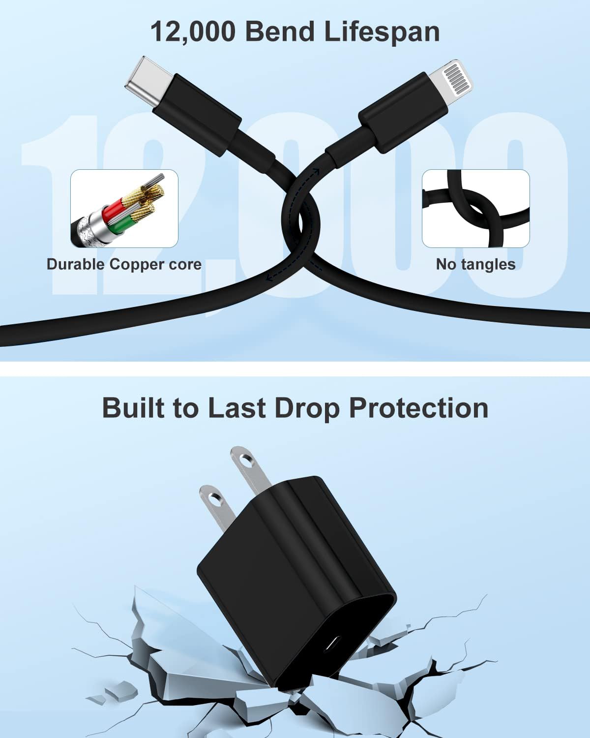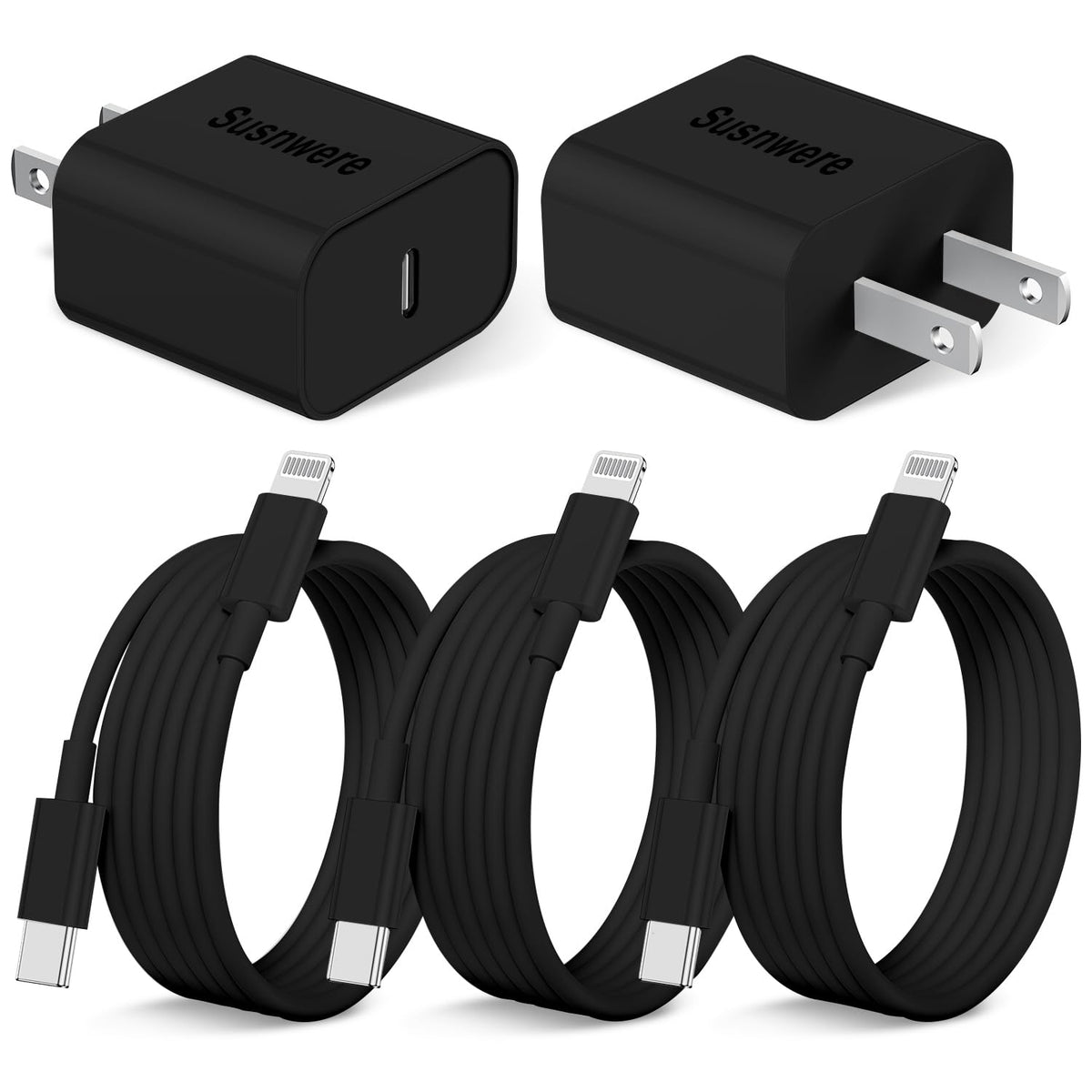 Susnwere Iphone 14 13 12 Charger Fast Charging, 2 Pack 20W Fast Pd Usb C Wall Charger Adapter With 3Pack 6Ft Usb C To Lightning Cable (Mfi Certified) For 14/14 Plus/14 Pro/14 Pro Max/13/ Black
