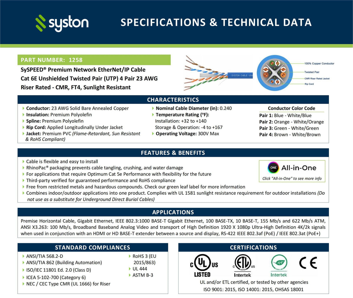 The Premium Syspeed Series Cat 6E Cable Offers True Digital Performance While Meeting The High Standards In Fire Resistance. Cat 6E 600Mhz Riser Cmr Rated Bulk High-Performance Cable. All Our Cables Are Rohs Compliant And Provide The Highest Standard For Your Professional Networking Needs. With Syspeed Ethernet Cat 6E Cable As Your Foundation, Your Network Is Ready To Meet Today�S Demand And Evolve To Meet Tomorrow�S Requirements. So, If You Want A High-Quality Cat 6E Or Cat 6 Ethernet Cable, Our Premium Copper, Unshielded Network Cable Is Certified Hazardous Substance-Free, Fire-Retardant, Sunlight-Resistant, And Easy To Install With An Outstanding Tangle-Free Design And Handy Features Like Clear Print Legend And E-Z Footage Markings To Make Installation An Absolute Breeze, And Suitable In A Wide Range Of Applications While Also Being Cost-Effective.