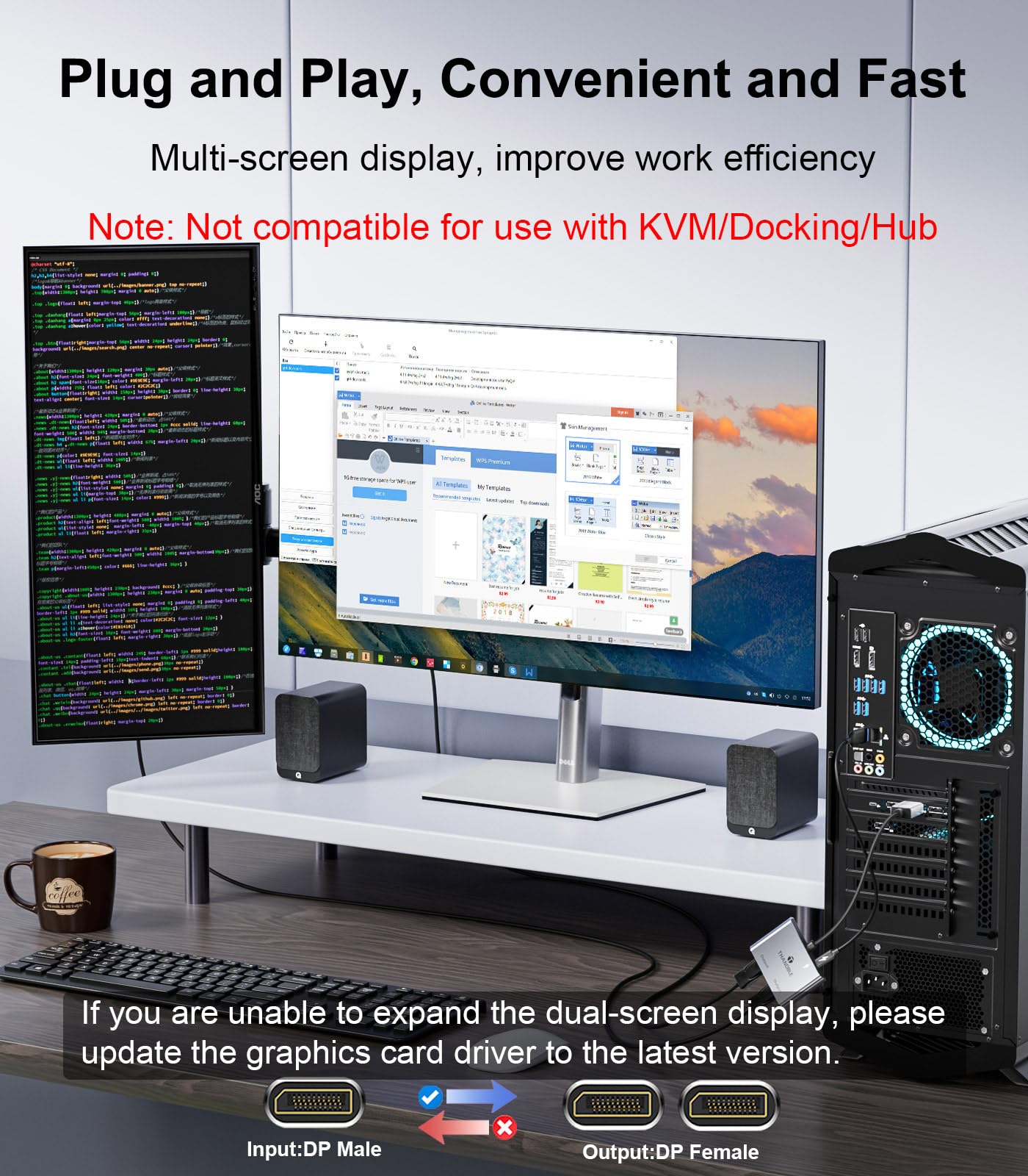 Q: Is this DisplayPort splitter compatible with all devices?A: Yes, this adapter is compatible with all devices that support DisplayPort, including desktops, laptops, and graphics cards with a bandwidth of 18Gbps or more.