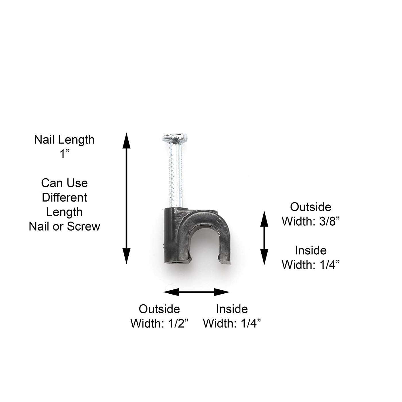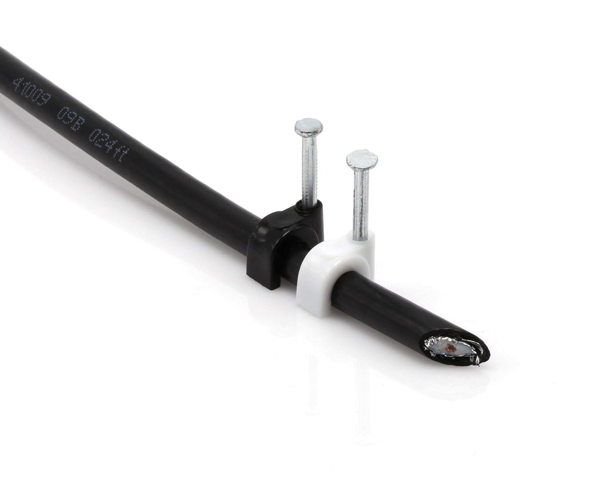 100 Pack Of Black Single Rg6 Cable Clips Use With Single Coax Cable, Cat5E, Cat6, Electrical Wire, Security Cable, Etc. Strong Nail Head, High Quality Solid Construction Indoor And Outdoor Rated Clip And Nail The Cimple Co, A Family Company Located In The Usa, Is Proud To Offer These Clips. They Are Available With Nail Or Screw Fastener, Manufactured With High Quality Uv Protected Materials And Long-Life Outdoor Rated Fasteners. By Using Specially Designed Clips For Coax, Data, And Other Cables-There Is No Loss In The Wire By Pinching Or Crushing' The Outer Jacket. This Leaves The Integrity Of The Cable Intact To Prevent Any Loss Of Signal, While Providing A Long-Life Installation. Screw Clips Are Designed To Be Removed And Adjusted If Every Needed; Nail Clips Are Great For Baseboards, Most Stucco, And Brick Mortar. Available In Sizes To Fit A Single Cable, Or Two - And In Black And White.