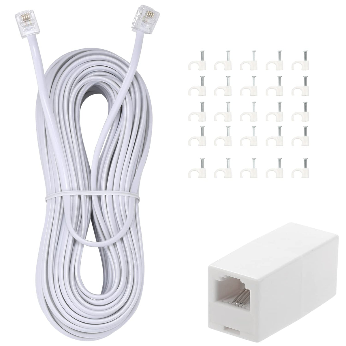 Toyayayo Long Telephone Extension Cord Phone Cable Line Wire, With Standard Rj11 Plug And 1 In Line Couplers And 25 Cable Clip H