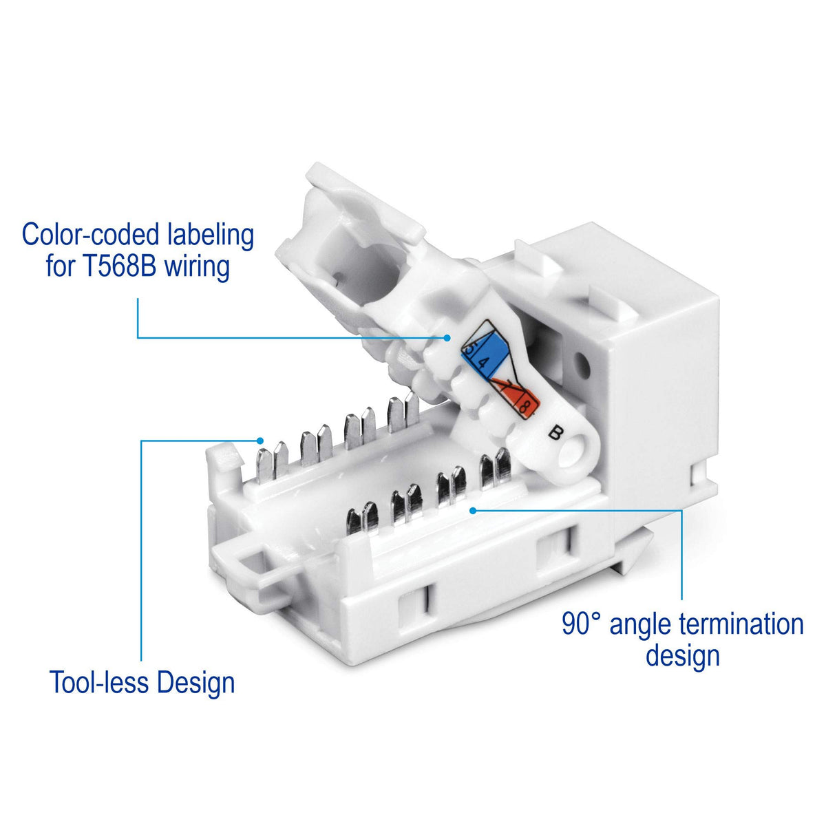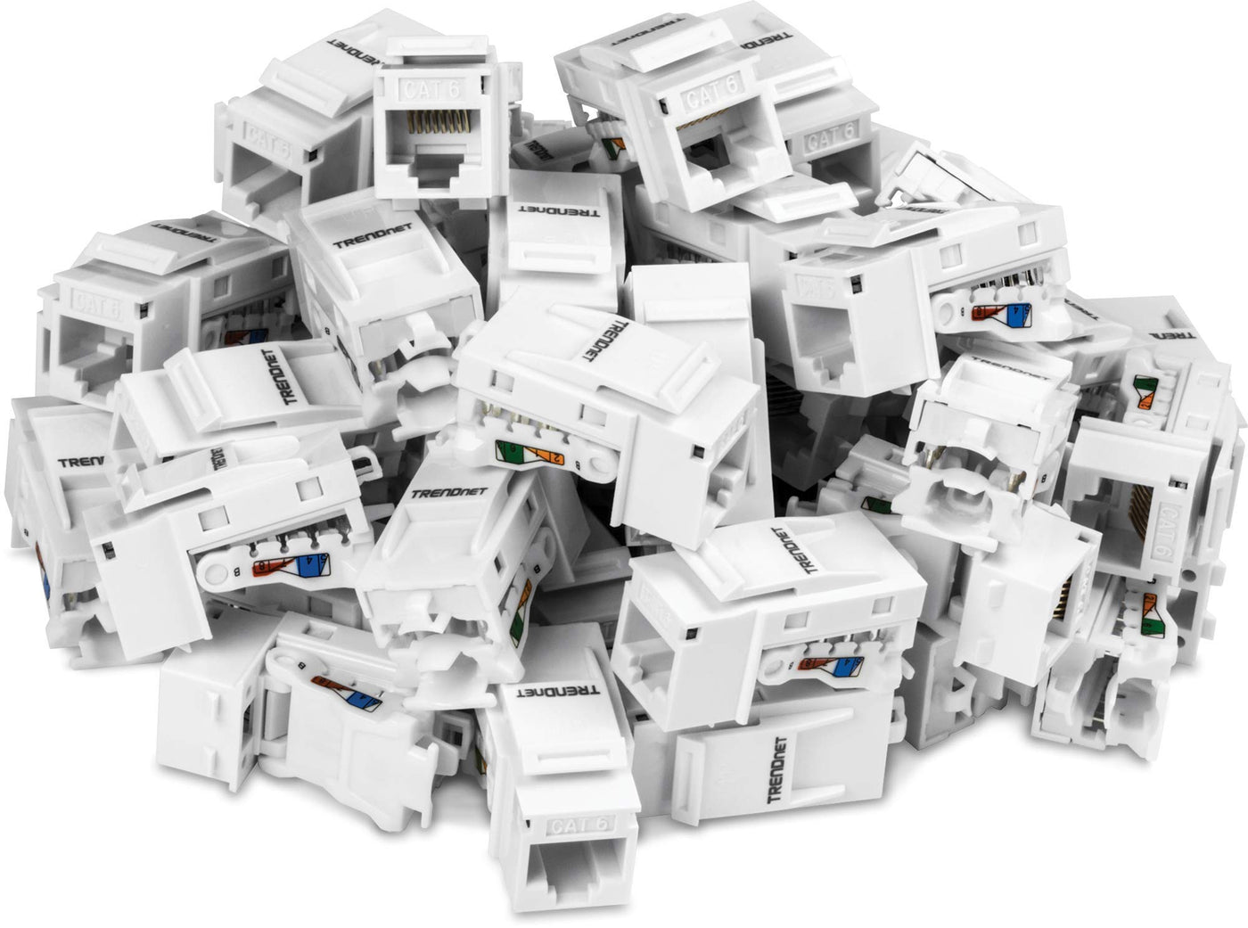 Trendnets Cat6 Keystone Jack 50-Pack, Model Tc-K50C6, Includes Fifty Cat6 Keystone Jacks For Use With Trendnets Tc-Kp24 Or Tc-Kp48 Blank Keystone Patch Panels (Sold Separately). Each Keystone Jack Provides Up To 10Gbps Speeds Over 55M (180 Ft. ) Of Cat6 Ethernet Cabling. These Cat6 Keystone Jacks Feature A Convenient Tool-Less Design With Wire Separation For Easy Cable Termination. Package Contents Tc-K50C6 X 50 Cable Ties X 50 Quick Installation Guide