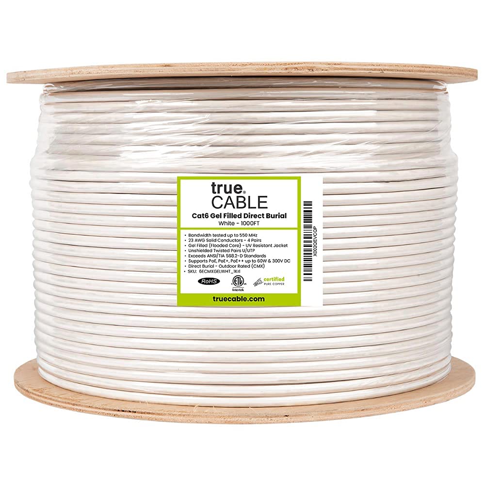 Truecable Cat6 Direct Burial, Gel Filled, 1000Ft, White, Waterproof, Cmx, 23Awg Solid Bare Copper, 550Mhz, Poe++ (4Ppoe), Etl Listed, Unshielded Utp, Bulk Ethernet Cable