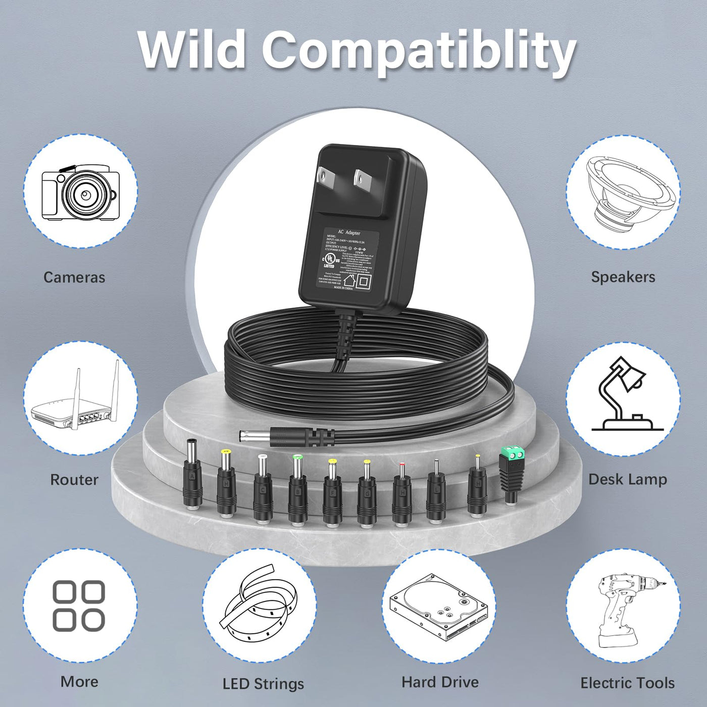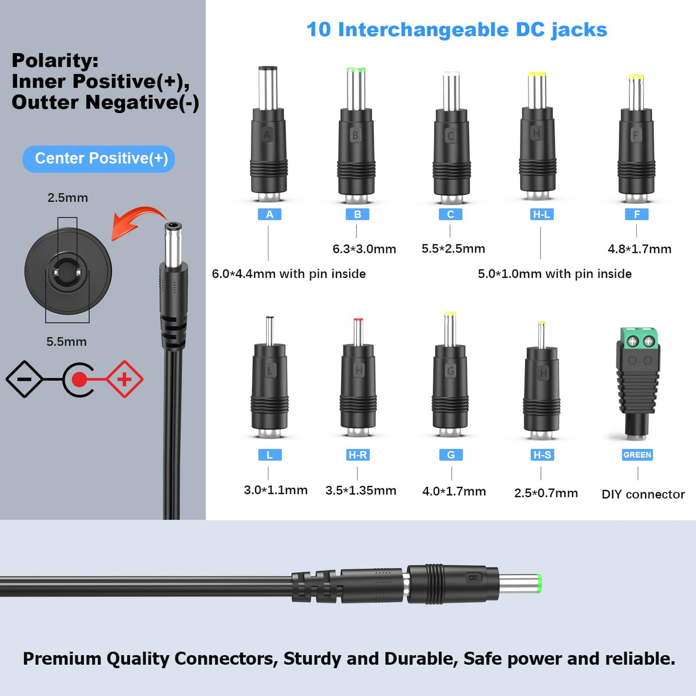 Ul Listed, Regulated 12V 1A Power Adapter Tested & Approved And Certified By Ul.Replacement Power Cord Build In Short Circuit/Over Current/Over Voltage/Over Temperature Protection, Safe Charging For Your 12V Devices. Charger Parameters Input: Ac 100-240V - 50/60Hz 0.3A. Output: Dc 12V 1A 12W Max Transformer.Cable Length: 6.0Ft Extra Long Power Cord. Weight: 2.5Ounce.Interchangeable Dc Tipsselected 10Pcs Various Popular Connectors Which Can Be Used For Most Of Your 12V 1A 12W Max Dc Devices.Multi Dc Jacks Dimensionsplease Double Confirm The Dc Jack Dimensions To Ensure The Compatibility. A: 6.0*4.4Mm With Pin Inside B: 6.3*3.0Mm C: 5.5*2.5Mm F: 4.8*1.7Mm G: 4.0*1.7Mm L: 3.0*1.1Mm Green: Led Terminal Connector H-Yellow(Small One): 2.5*0.7Mm H-Yellow(Big One): 5.0*1.0Mm With Pin Inside H-Red: 3.5*1.35Mm Dc Jack Of The Power Supply: 5.5*2.1Mmwill It Work With My Device? 1, Please Confirm Your Old Power Adapter Whether It Is 12V 1A. 2, Dc Jack Polarity: ??Inner Positive(+), ??Outter Negative(-). 3, Please Double Confirm Your Old Power Supply'S Dc Connector Dismensions Was Listed Above.Ps: These Answers Can Be Found On Your Old Power Adapter.What You Get 1 X 12V 1A 12W Max Ac To Dc Power Supply. 10 X Dc Jacks.