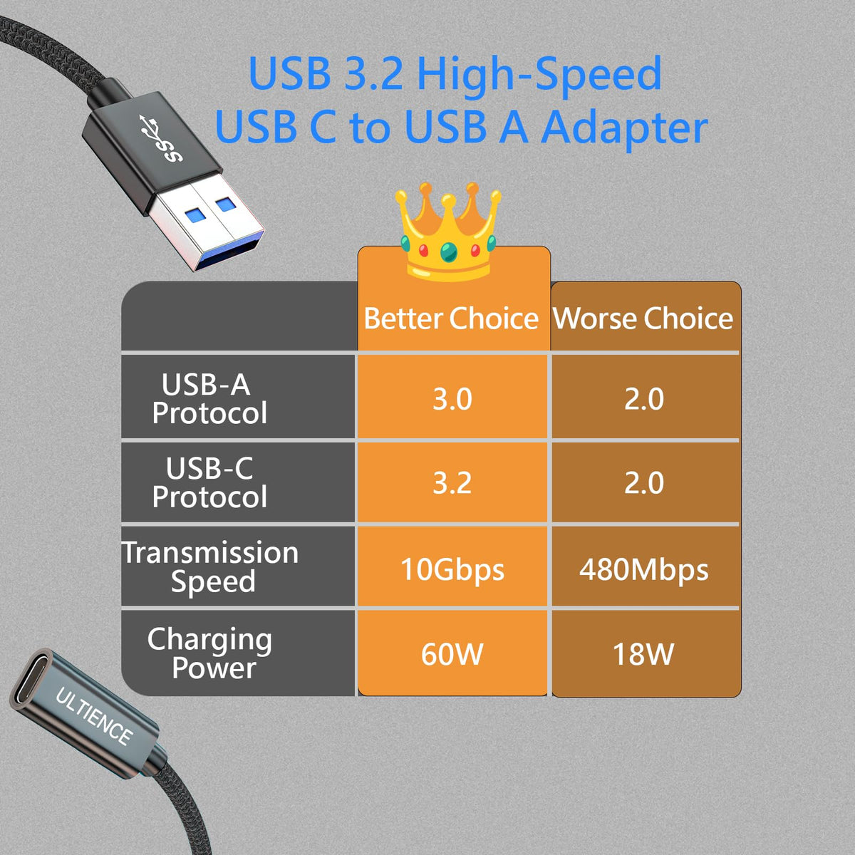 Ultience [10Gbps] High Speed A To C Adapter With Usb To Usb C Cable, And Female Usb C Cable 60W Fast Charging And Data Transfe