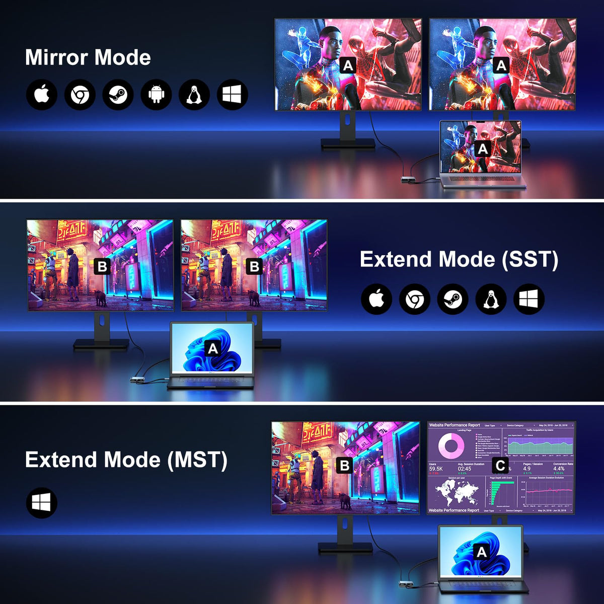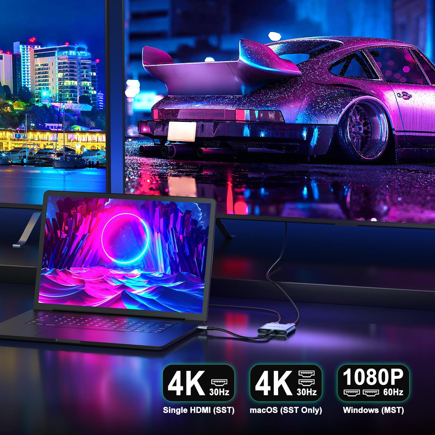 ?Extend Display?The Avidgram Usb-C Multiport Adapter Features Two Hdmi Ports, One Usb-A 3.0 Port, And One 100W Pd Charging Port. Note: Android Only Supports Aaa Mode (Mirror Mode), Macos Supports Aaa And Abb Mode (Does Not Support Mst Abc Mode), And Windows Supports Aaa, Abb, Aba, And Abc Mode. | ?4K Resolution?Supports Up To 4K@30Hz, With Backward Compatibility At 60Hz For Resolutions Of 2K/1080P. Note: To Achieve 4K Resolution, Ensure Your Device Supports 4K And Use An Hdmi Cable 2.0 Or Higher. | ?Plug And Play?No External Power Supply Or Driver Is Required, Simply Plug And Play. Note: Not Compatible With All Usb-C Port Laptops, Ensure Your Laptop Or Pc Supports Thunderbolt 3 Or Displayport Mode (Dp Alt Mode). | ?Broad Compatibility?Compatible With Linux, Windows, Macos, And Android Systems, With Thunderbolt 3 And Dp 1.4 Alt Mode Support. Works With Macbook/Macbook Pro, Xps, Lg, Hp, Galaxy, And More. | ?What You Get?Avidgram 4 In 1 Usb-C Hub X1, User Manual X1, With A Hassle-Free 2-Year Warranty And Lifetime Technical Support. Contact Our Friendly Customer Service For Any Questions.