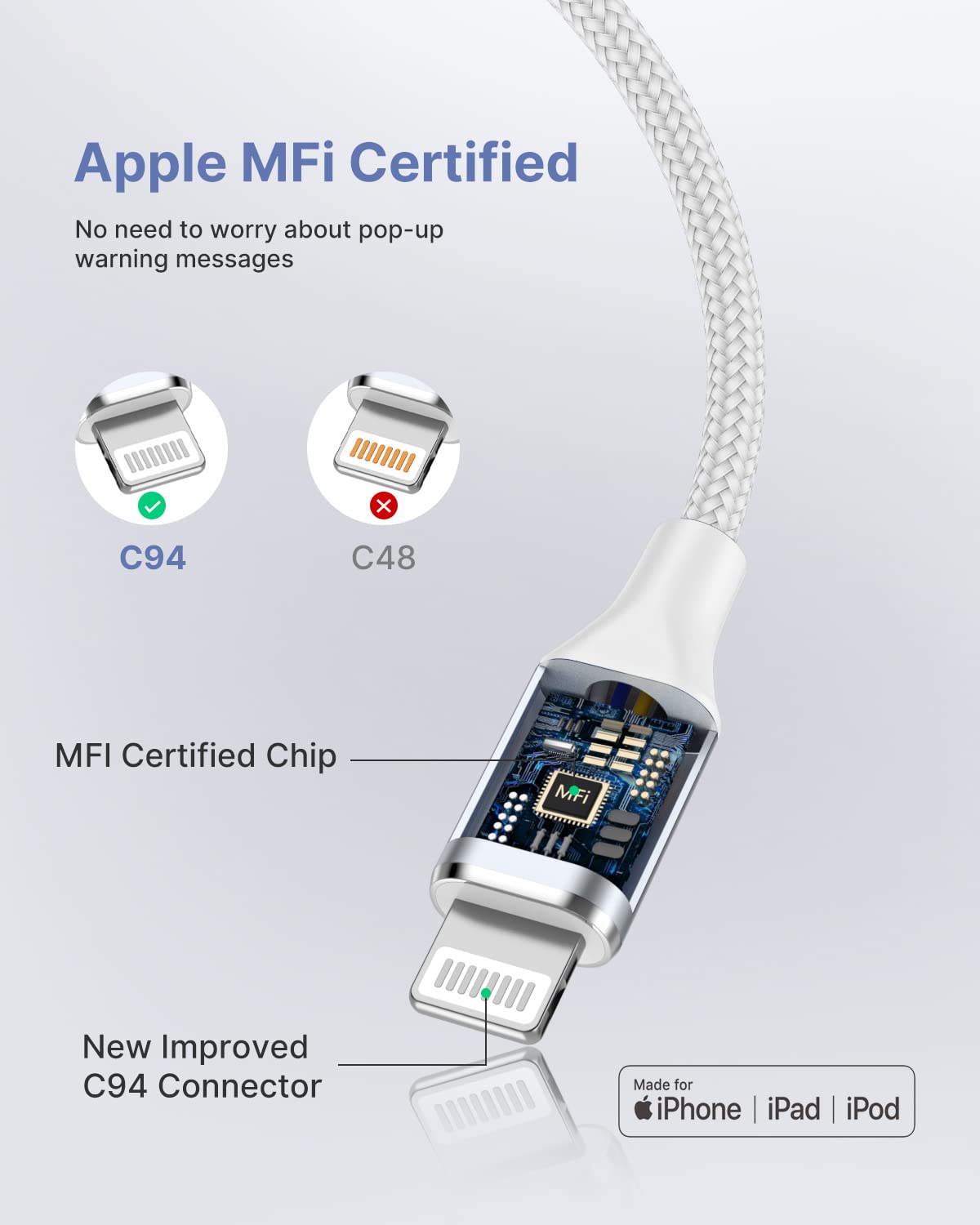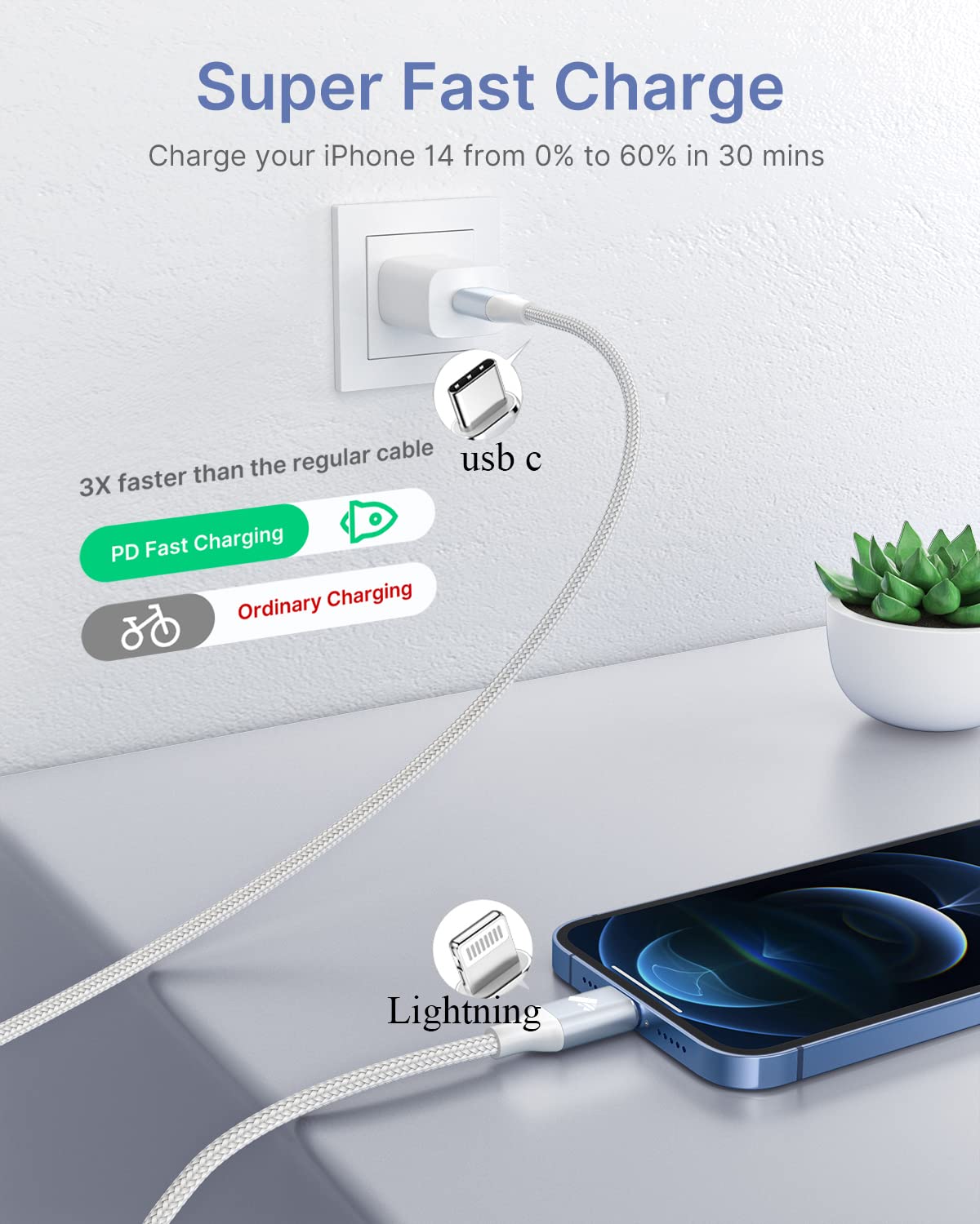 ?Extra Long & High Quality Assurance? 2Pack 10Ft Extra Long Iphone Charger Cables Make Charging At Home, In The Office , Etc. Without Being Limited By Sockets, Making Charging More Convenient.Aiminu'S Usb C Iphone Charging Cable Includes Built-In Overvoltage Protection And Is Tested To 10,000 Bends For Extra Durability. The Premium Nylon Braided Cable Adds Extra Durability And Tangle Free. | ?Power Delivery Fast Charging & Sync?Usb-C To Lightning Cable Fast Charging Up To 3A (Max). It Also Supports Data Transfer Rates Up To 480Mbps, Making It Easy To Transfer Files Between Iphone And Laptop In Seconds. Note: You Need A Usb-C Port Wall Charger To Match It. (Includes 18W, 20W, 30W, 60W Or 87W Usb-C Power Adapter). | ?Perfectly Compatible Usb C To Lightning Cable?Aiminu Usb C To Lightning Cable Supports Pd Fast Charge 3A (Max) For Iphone 14/14 Pro/14 Pro Max/14 Mini/ 13/13 Pro/13 Pro Max/13Mini/ 12/12 Mini/12 Pro/12 Pro Max/11/11 Pro/11 Pro Max/Xs Max/Xs/Xr/X/8 Plus/8 And Ipad 8Th Ipad 2020, Ipad Pro 12.9'' Gen1/Ipad Pro 12.9'' Gen2/Ipad Pro 10.5''; This Cable Also Supports Standard Charge (5V/2.4A Max) For Iphone 7 Plus/7/6 Plus/6/6S Plus/6S Etc. Note: You Need A Usb-C Wall Charger To Achieve Fast Charging. | ?Mfi Certified Type C Iphone Charging Cord?Mfi Certified Type C To Iphone Cable Uses The Newest C94 Lightning Connector, Which Support Quick Charger For Lightning Device, C94 Usb C To Lightning Cord More Stable, Safe, Faster Than Nomal Iphone Cable. | ?What You Get?Aiminu 2Pack 10Ft Extra Long Braided Type C Iphone Charging Cord (White), Worry-Free 18-Month Warranty And 24/7 Customer Service.