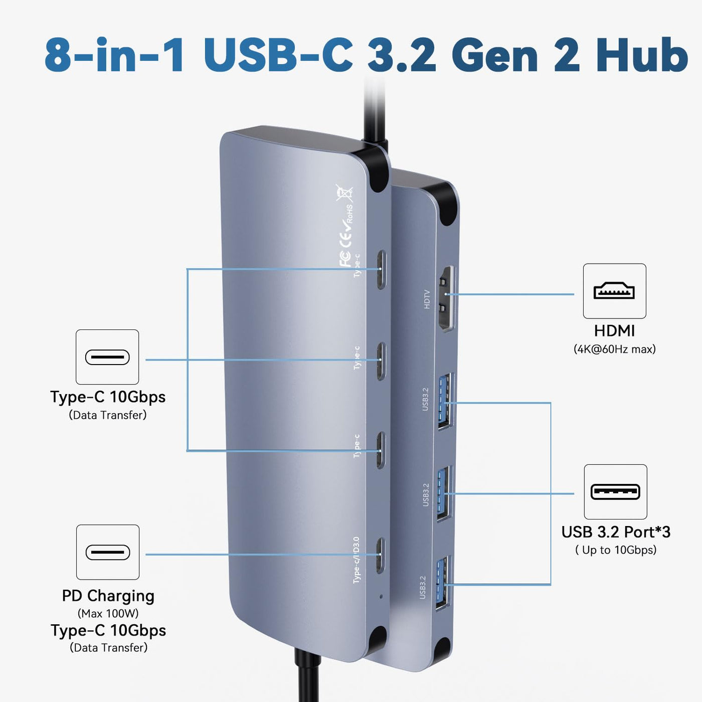 Usb C To Usb Hub 8 In 1 With 4K@60Hz Hdmi, 3 Usb C 3.2 Gen2 10Gbps, 3 Usb A 3.2 10Gbps Ports,100W Power Delivery With 10Gbps Dat