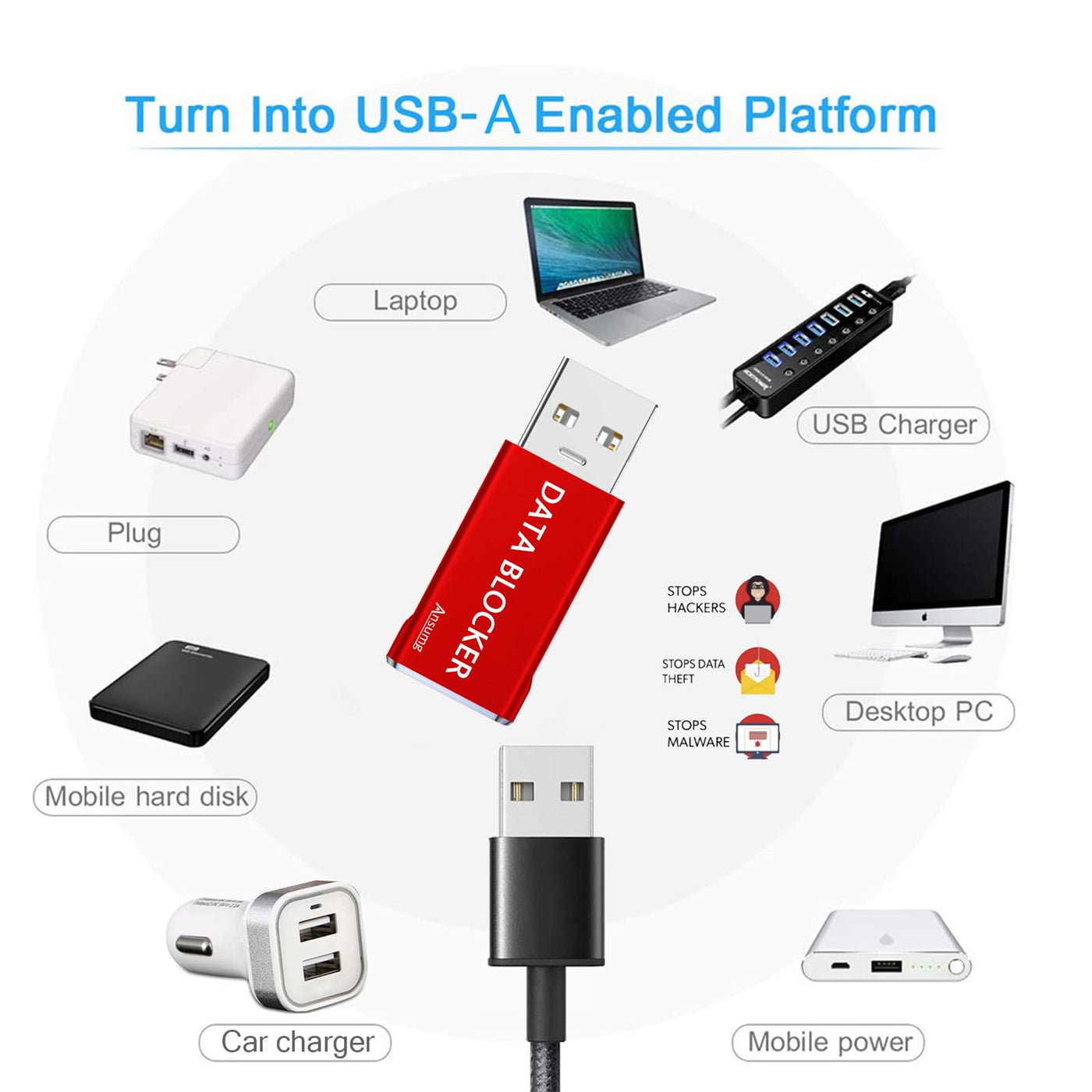 Data Blocker Data Blocker Usb Usb Data Blocker 1)Usb Data Blocker Adapter Blocks The Number 1 Threat For Identity Theft - Juice Jacking 2)You Can Plug Any Of Your Devices Into Your Computer, Your Work Computer, Or You Friends Computer And Dont Have To Worry About Connections Or Drivers Or Auto-Starting Nonsense It Just Charges 3)You Can Plug It Into A Rental Car Or A Friends Car And Not Have To Deal With Messing Up Radios, Song Libraries, Etc It Just Charges 4)It Is Especially Suitable For Charging The Usb Interface On The Car, And It Will Not Affect The Pop-Up Prompt On The Display Screen Because Of Data Transmission Connected With The Mobile Phone, Or Even The Navigation System Of Your Car 5)Especially Suitable At The Airport When Traveling In Public Areas When Riding In Someones Car To Hide Your Information,Fast Charging :Up To 24A (12W) Charging Speed 6)100% Data Security,The Two Data Pins Is Cut Off Physically From This Data Blocker 7)Aluminum Shell Design :20X More Durable Than Plastic Shell,10000+ Plug Lifespan Metal Usb-A Defender 8)Stop Data Theft No Pop-Ups No Data Channel For Hackers To Steal Data,Protect Against Juice Jacking