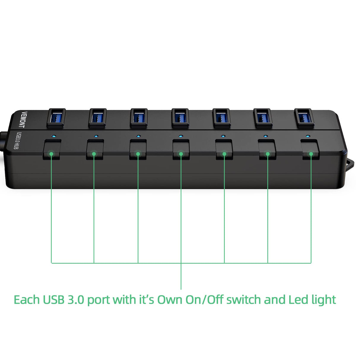 ?Usb Hub?:With This Computer Networking Hubs, You Can Make It Instantly Add 7 Usb 3.0 High-Speed Port Extensions That Connect Multi Usb Port Devices To Your Computer Or Laptop At The Same Time.For Example: Keyboard, Mouse, Card Reader, Earphone, Etc.Extensive Compatibility,Usb Data Transmission Speed Up To 5Gbps, Can Transmit A High-Definition Movie In A Few Seconds.Backwards Compatible With Usb 2.0Devices. | ?Usb Multiport?: Each Port On The Usb 3.0 Hub Has Its Own Power Switch, Each Port Has A Separate Indicator Light,So You Can Turn On/Off Devices When They'Re Not In Use And Each Individual Usb Port Is Independently Controlled And Not Affect Each Other. | ?Usb Hub Long Cable?:Usb Long Cable 4Feet/1.2M Length Build In Import Cable, Enhanced Connectivity To Hub Body, Dispel Your Concerns For Too Short To Connect To Your Pc/Tablet. | ?Portable Design?:This Compact Usb Hub Is Portable Enough For Work And Travel , Usb Is Used Widely In Each Field Because Of Its Many Merits, Such As Transmitting At A High Speed, Plug-And-Play, And When Developed, It Costs Less Manpower And Material Resources,7-Port Usb 3.0 Hub Compatible With Windows 10, 8.1, 8, 7, Vista, Xp, Mac Os X (10.X Or Above), Linux Etc. | ?We Offer?:Vemont 7 Port Usb 3.0 Hub With 1.2 Meter Usb 3.0 Cable, User Manual, 18 Month Warranty And Professional Customer Service.
