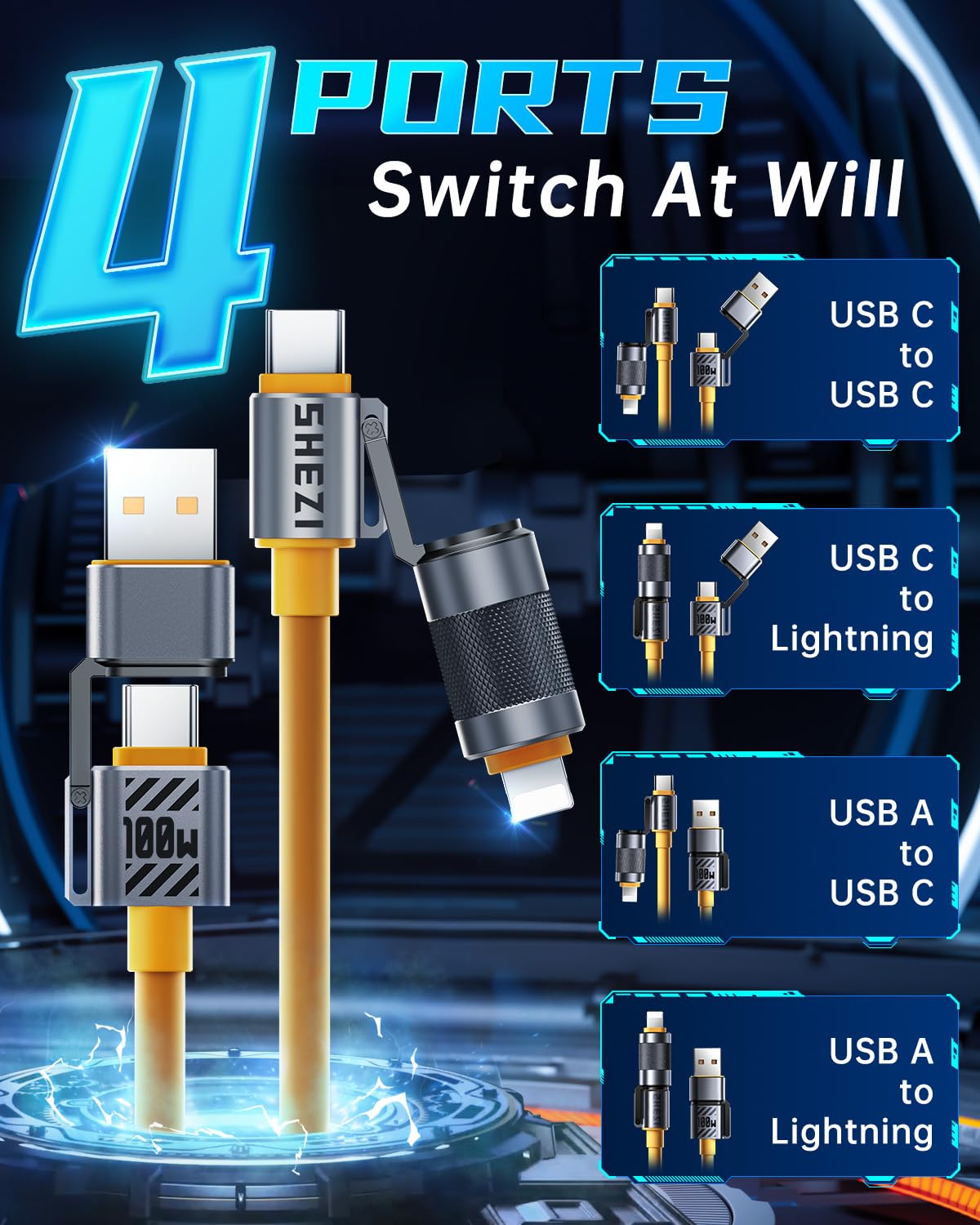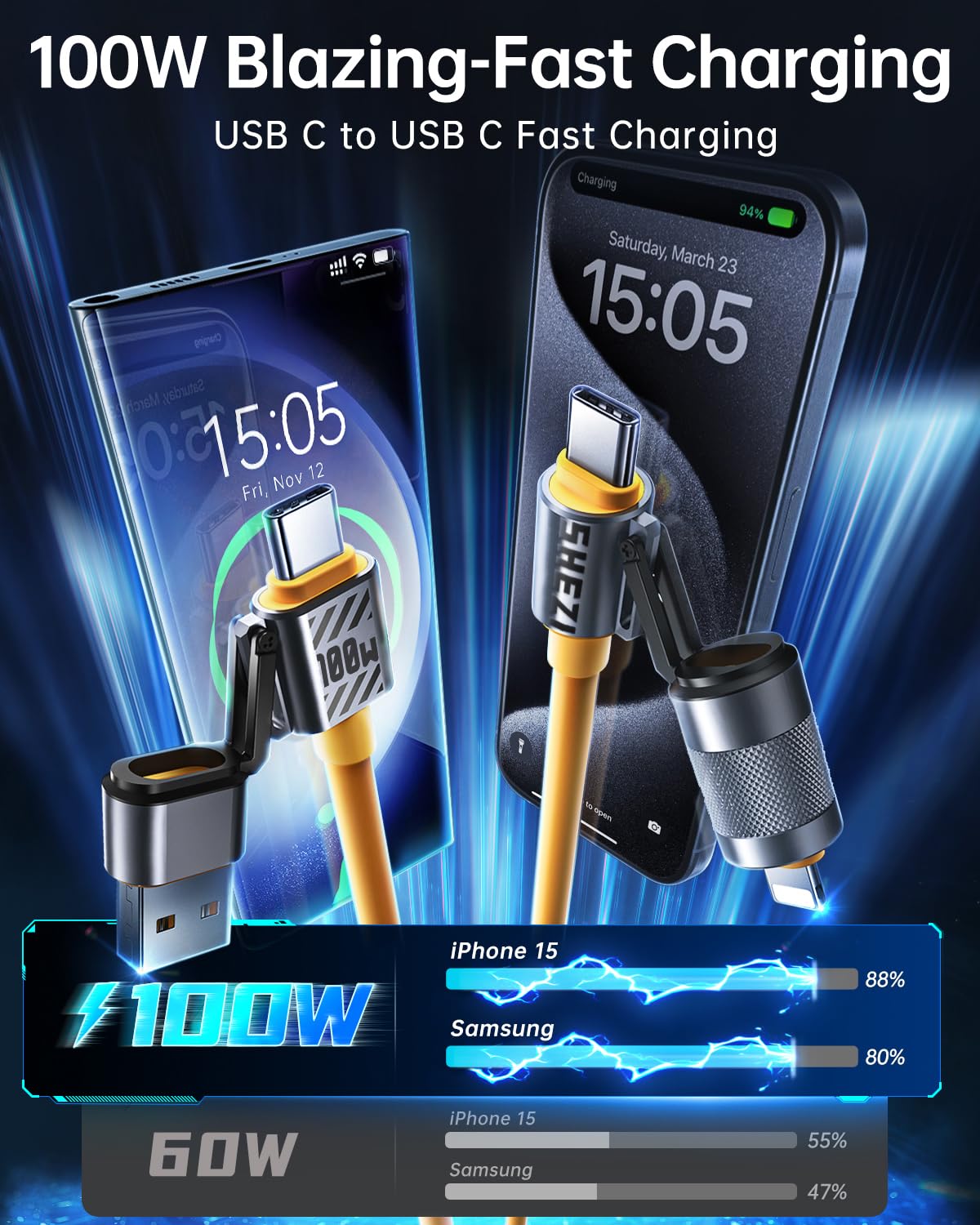 Brand: Vexipia Product Description: ? 4-In-1 Versatile Design [Usb C To C Cable/Usb C To Lightning Cable/Usb A To C Cable/Usb A To Lightning Cable]; ? 100W Fast Charging; ?480Mbps Data Syncing; ?Support Apple Carplay & Android Auto; ?Strong Aluminum Alloy Housing; ?Thicker Silicone Material Product Specification: Length: 5Ft/1.5M Color: Yellow Watts: 100 Watt Package Include: 1* 4 In 1 100W Usb C Fast Charging Cable 1*Leather Strap