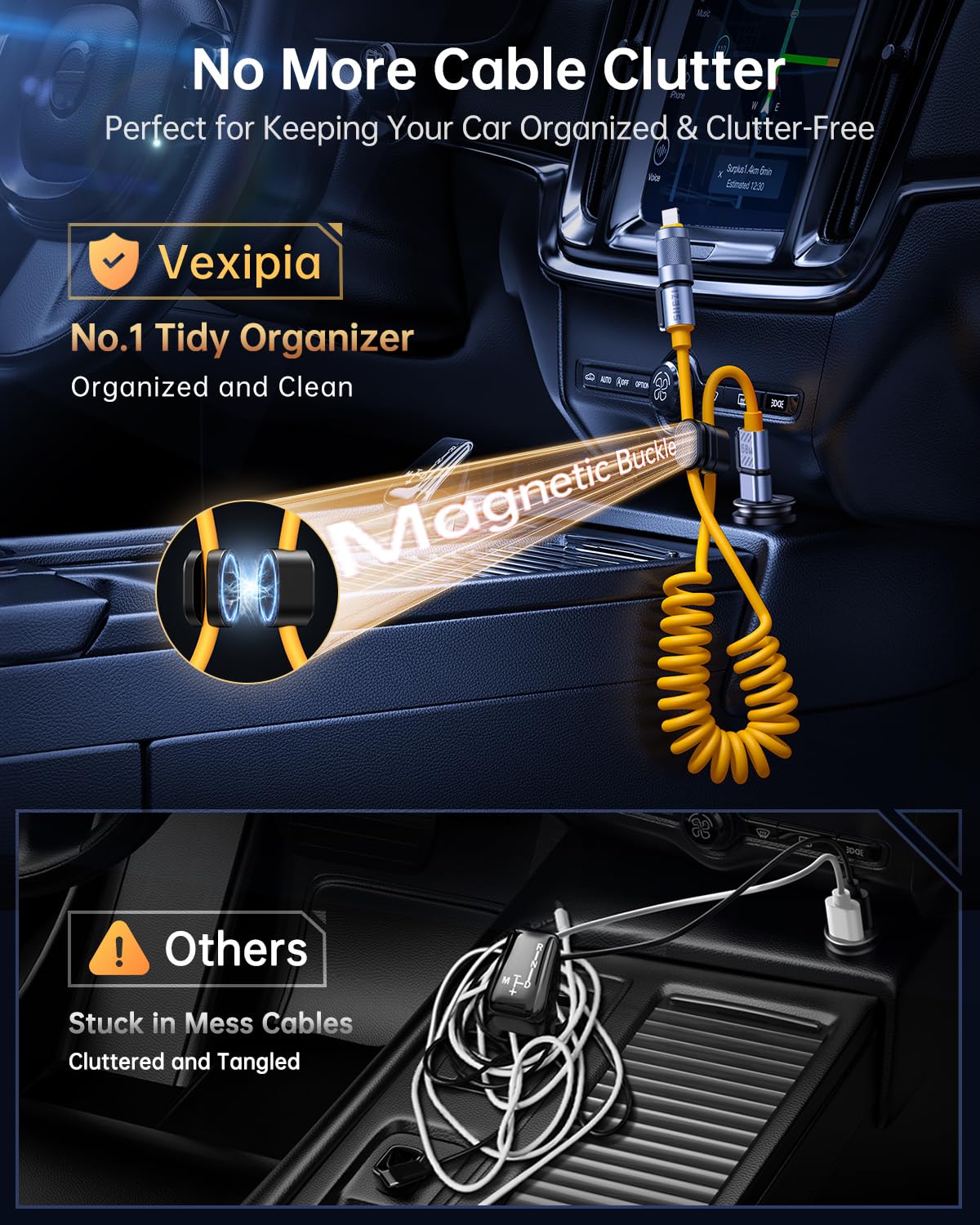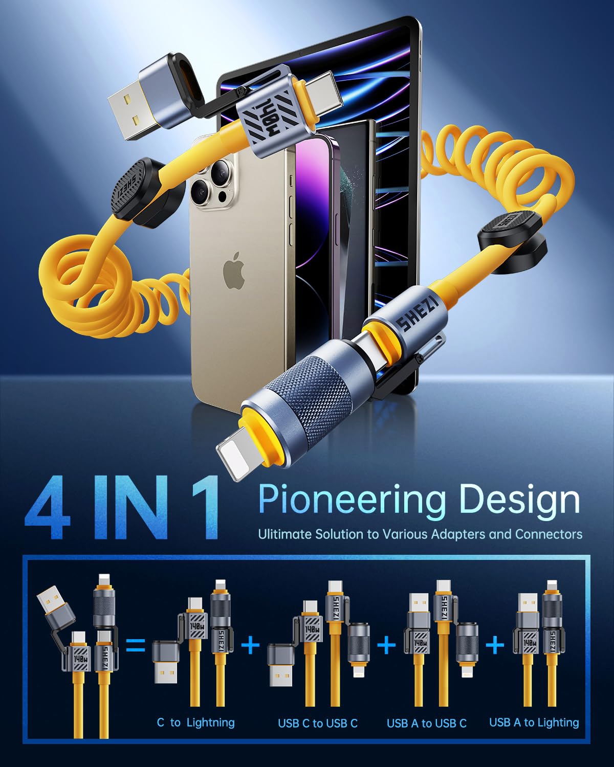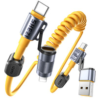 Brand: Vexipia Product Description: ? 4-In-1 Coiled Versatile Design [Usb C To C Cable/Usb C To Lightning Cable/Usb A To C Cable/Usb A To Lightning Cable]; ? 140W Fast Charging; ? 480Mbps Data Syncing; ? Support Apple Carplay & Android Auto; ? Strong Aluminum Alloy Housing; ? Thicker Silicone Material Product Specification: Length: 5Ft/1.5M Color: Yellow Watts: 140 Watt Package Include: One Cable Plus Magnetic Management