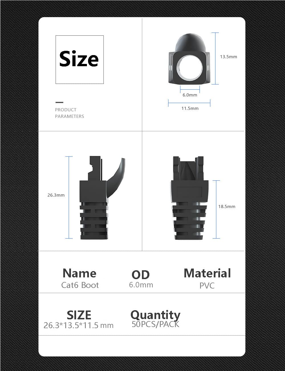 Fits Standard Rj-45 Modular Plugs, The Boots Od 6Mm For Lan Cable Od 5 - 6Mm (0.197 - 0.236Inch). Material: Environmental Protected Plastic. Size: 1.04 Inch X 0.53 Inch X 0.45 Inch.Colors: Black, Blue, Green, Grey, Dark Grey, Orange, Purple, Red, Transparent, White, Yellow. Quantity: 50 Pcs/Pack.