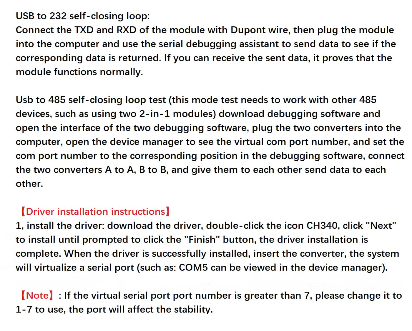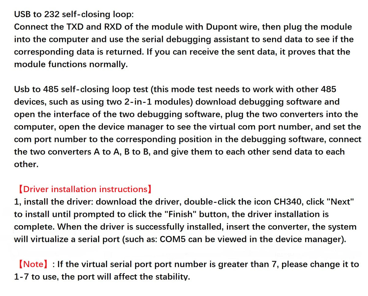 Wwzmdib Usb To Rs485 Rs232 Converter The Product Can Support Usb To Rs232 And Usb To Rs485, But The Two Functions Cannot Be Used At The Same Timeusb To Rs485 Rs232 Converter: The Product Can Support Usb To Rs232 And Usb To Rs485, But The Two Functions Cannot Be Used At The Same Time.Rs-485 Flow Control Mode Automatic Flow Control.Voltage:Ubs 5Vnew Original Chip Ch340,Transmission Distance Up To 1200 Meters (Tested At 9600Bps)Support Baud Rate Rs232: 300Bps-120Kbps. Rs485:300Bps-1Mbps.Support Win98/Ce/2000/2003/2008/Xp/Win7/Win8/Win10/Vista/Linux/Mac Os X System, Usb Interface Can Be Hot-Swappableindustrial Grade Protection: Tvs Transient Suppression Protection, Esd Protection, Surge Protection, Ab Signal Line Shorting And Shorting Protection With Power Supply (Shorting Does Not Burn)Rs485 Bus Wiring Mode:Converter Terminal A - 485 Device A (D+)Converter Terminal B - 485 Device B (D-)Converter Terminal Gnd - 485 Device Gndrs232 Bus Wiring Method: Converter Terminal Rxd--232 Device Txdconverter Terminal Txd--232 Device Rxdconverter Terminal Gnd - 232 Device Gndusb To 232 Self-Closing Loop:Connect The Txd And Rxd Of The Module With Dupont Wire, Then Plug The Module Into The Computer And Use The Serial Debugging Assistant To Send Data To See If The Corresponding Data Is Returned. If You Can Receive The Sent Data, It Proves That The Module Functions Normally.Usb To 485 Self-Closing Loop Test (This Mode Test Needs To Work With Other 485 Devices, Such As Using Two 2-In-1 Modules) Download Debugging Software And Open The Interface Of The Two Debugging Software, Plug The Two Converters Into The Computer, Open The Device Manager To See The Virtual Com Port Number, And Set The Com Port Number To The Corresponding Position In The Debugging Software, Connect The Two Converters A To A, B To B, And Give Them To Each Other Send Data To Each Other.Driver Installation Instructions1, Install The Driver: Download The Driver, Double-Click The Icon Ch340, Click ''Next'' To Install Until Prompted To Click The ''Finish'' Button, The Driver Installation Is Complete. When The Driver Is Successfully Installed, Insert The Converter, The System Will Virtualize A Serial Port (Such As: Com5 Can Be Viewed In The Device Manager).Note: If The Virtual Serial Port Port Number Is Greater Than 7, Please Change It To 1-7 To Use, The Port Will Affect The Stability.2, Set The Com Port: Set The Virtual Serial Port Number To The Corresponding Location Of The Software. Such As Set To The Serial Debugging Software Com Port; Can Be Used. No Matter What The Driver Installation;'