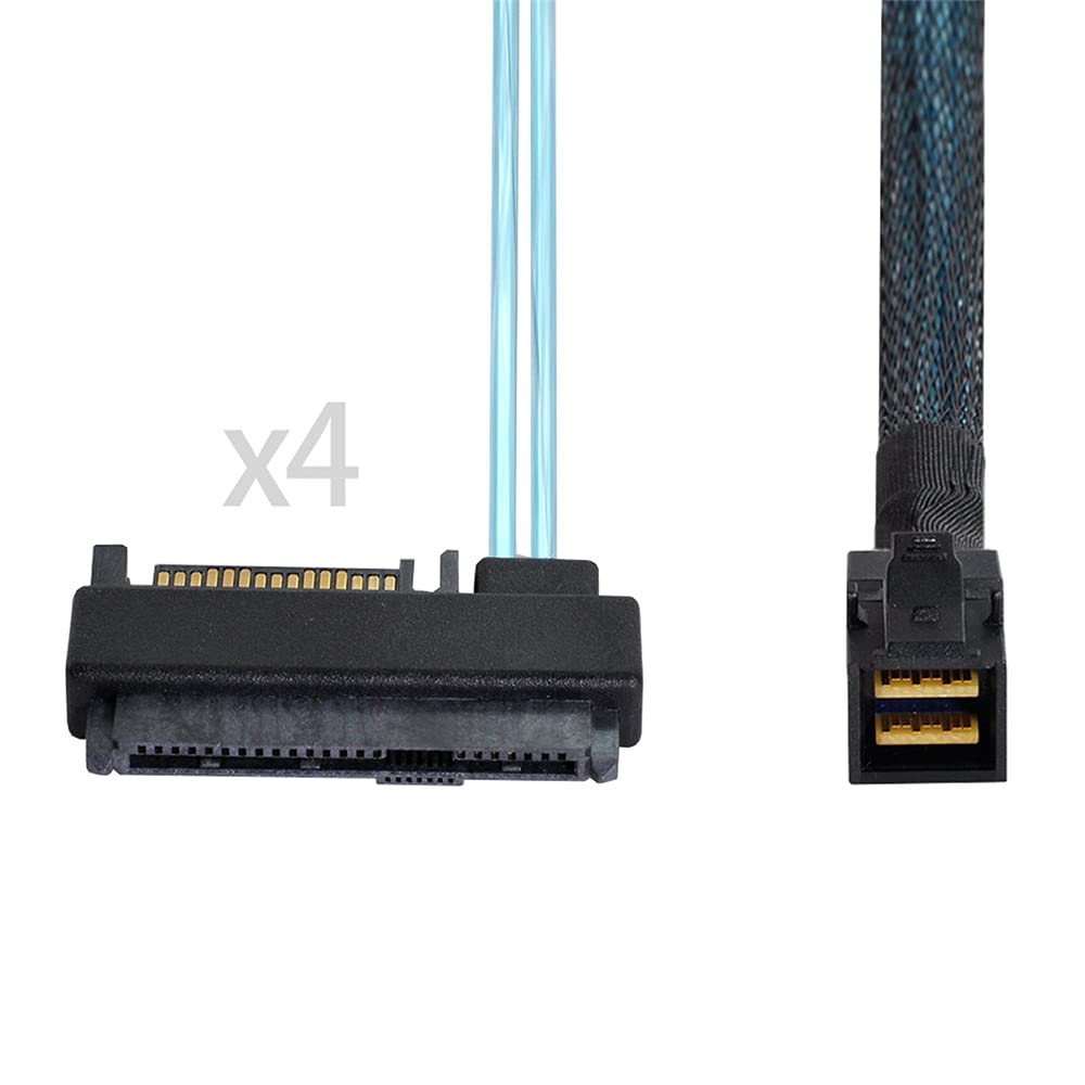 Q: What are the specifications of this Mini SAS cable?A: This cable features a Mini SAS HD SFF-8643 connector on the host side and 4 SAS 29-pin connectors on the device side, supporting data transfer speeds of up to 6Gbps as per the SAS 2.1 standard.