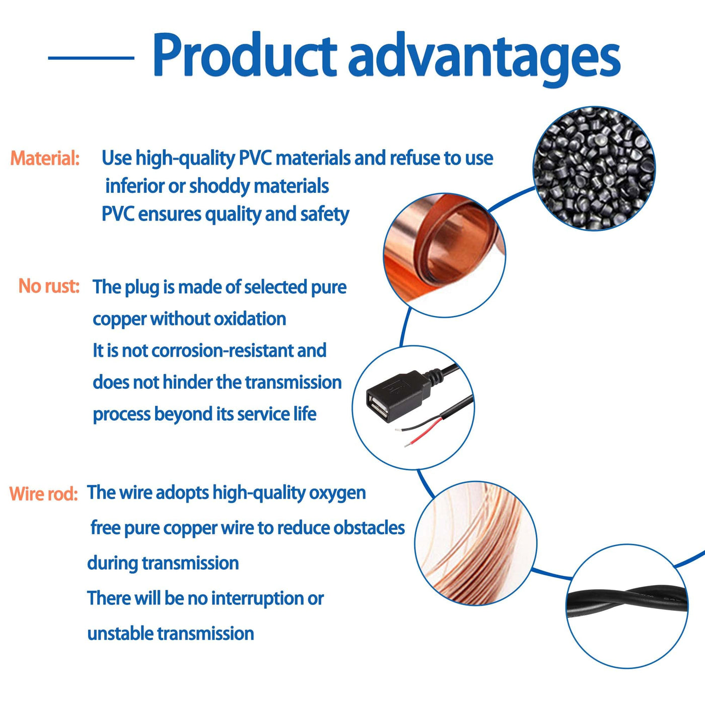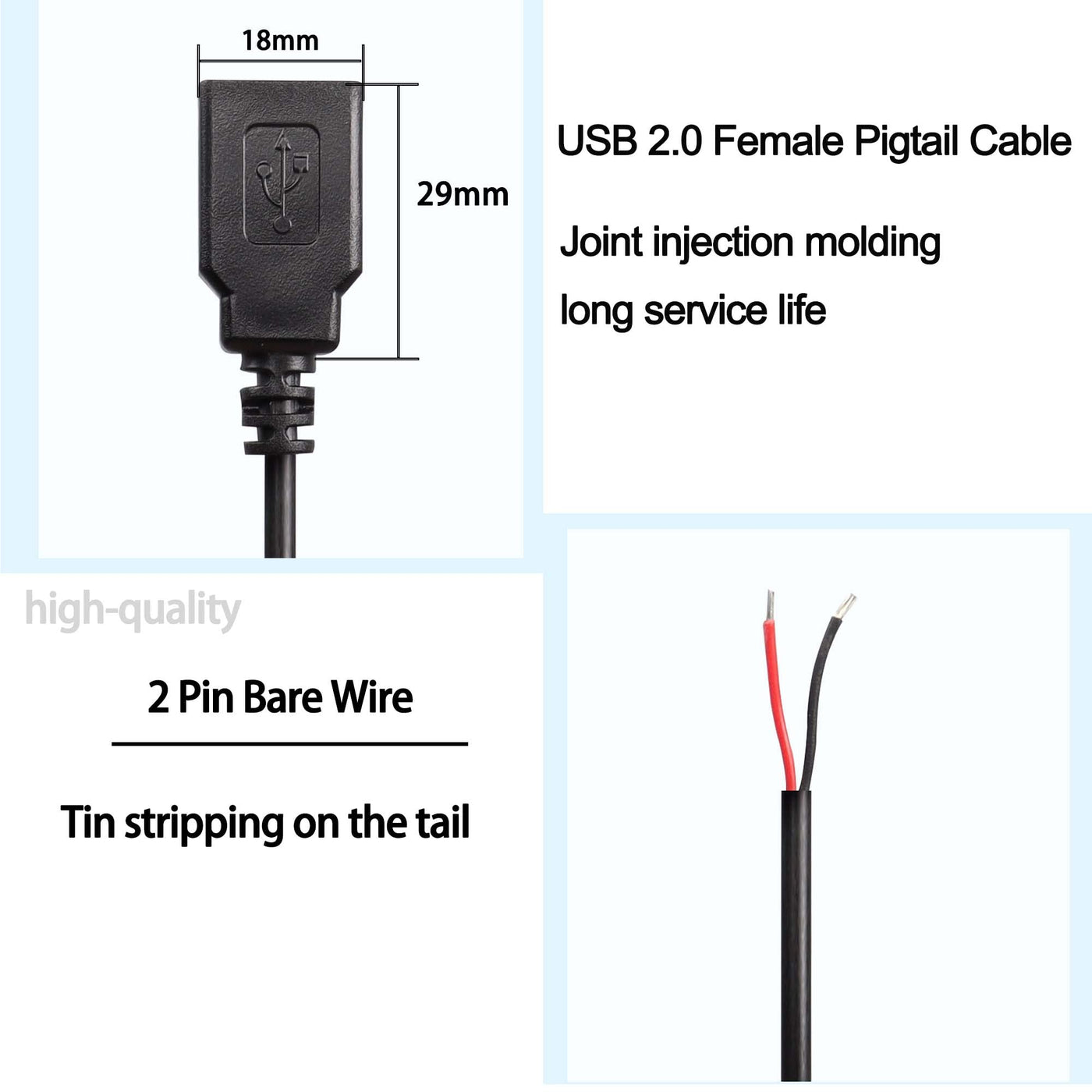 This Usb 2.0 Female Pigtail Power Cable Has One End Of Usb2.0 A Female Socket And The Other End Of 2-Pin 2-Wire Bare Wire. It Is Used For Diy Any Device That Needs 5V Usb Charging.This Usb A Female To Bare Wire Is Made Of High-Quality Pvc Material,The Pure Copper Oxygen Free Core, The Resistance Is Smaller, The Connector Is Injection Molded, And The Service Life Is Long.The Usb 2.0 Female Pigtail Cable 22Awg, Rated Voltage: 5V, Max 3A,Easy To Operate.It Is Applicable To Power Cord Of Driving Recorder, Led Desk Lamp, Usb Fan, Small Appliance Light Belt, Power Adapter, Power Charging Stand, Usb Socket Panel, Circuit Board, Bedside Lamp, Low-Power Electrical Equipment Around Computer And Various Small Appliances. Package Include:2*Usb A Female Pigtail Power Cable
