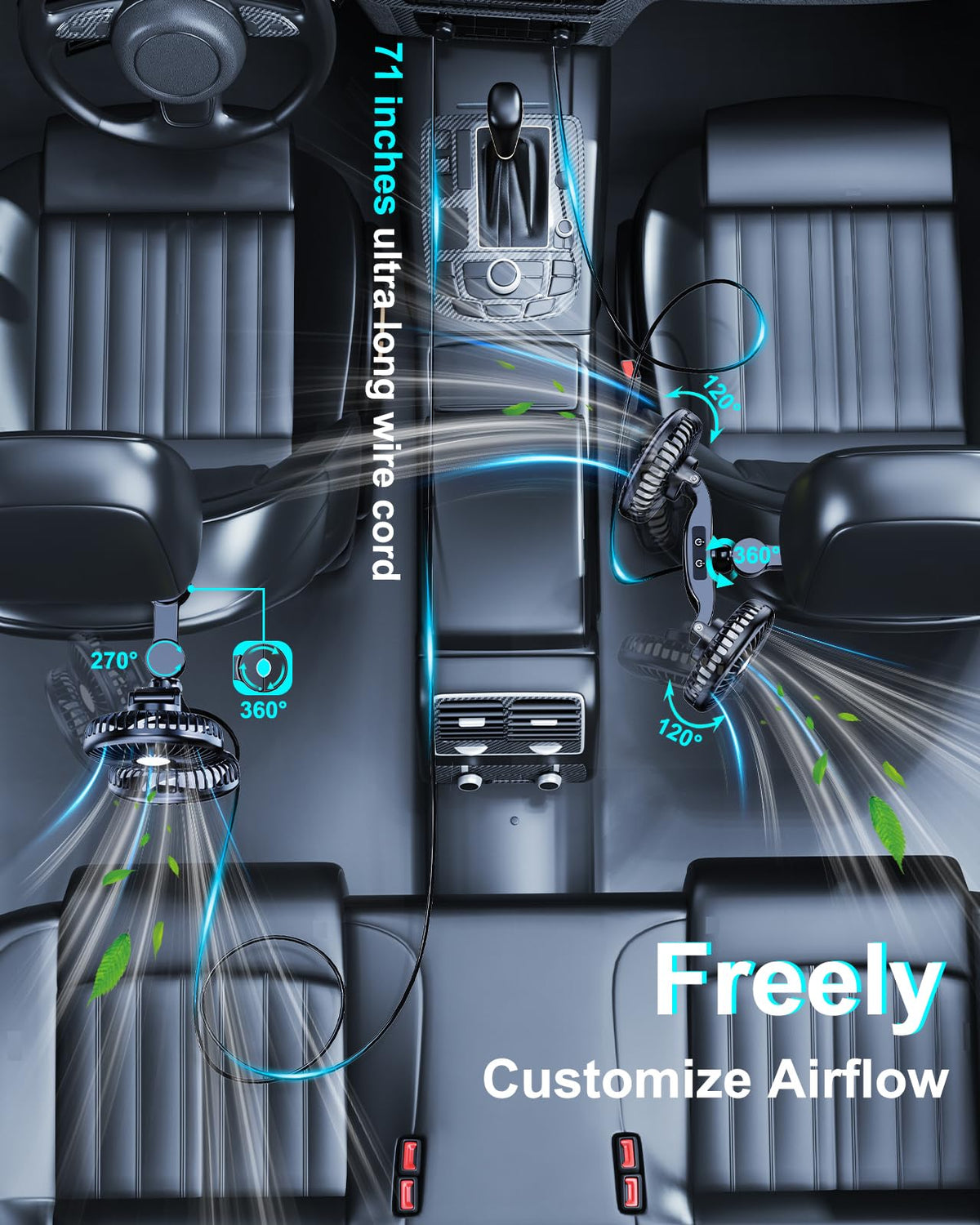 Q: What makes the xuenair Car Fan suitable for backseat use?A: The xuenair Car Fan features dual fans that are 120° adjustable, 360° rotatable, and a 270° adjustable ball joint, allowing for customized airflow to both the backseat and front seat. This flexibility ensures that passengers in different seating positions can enjoy optimal cooling.