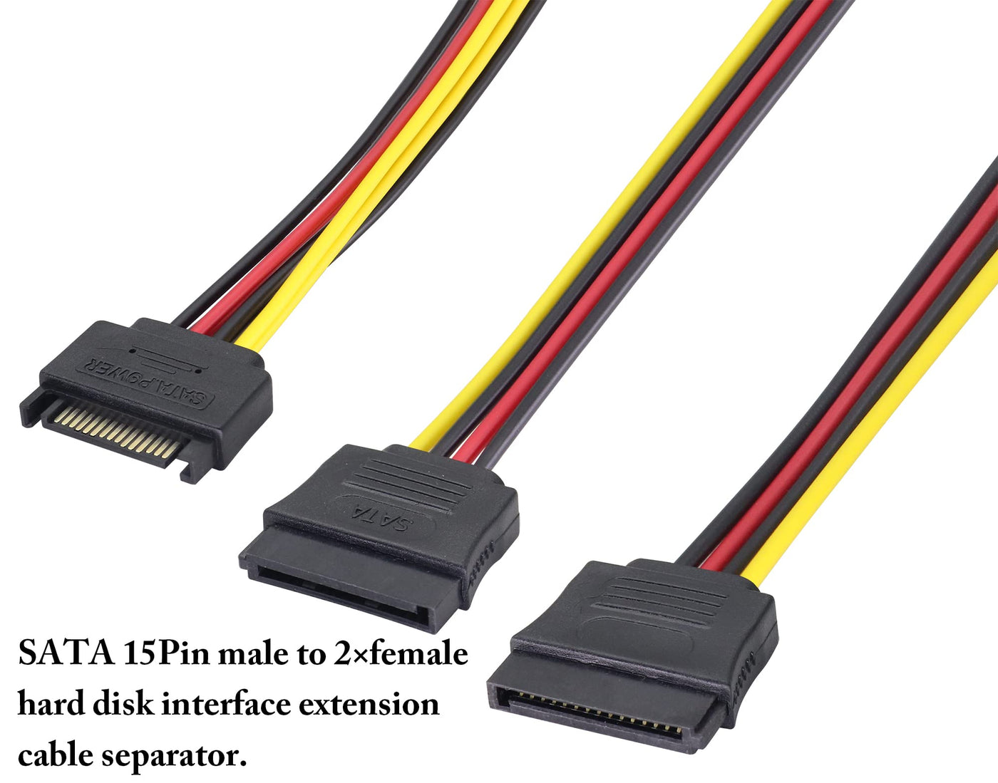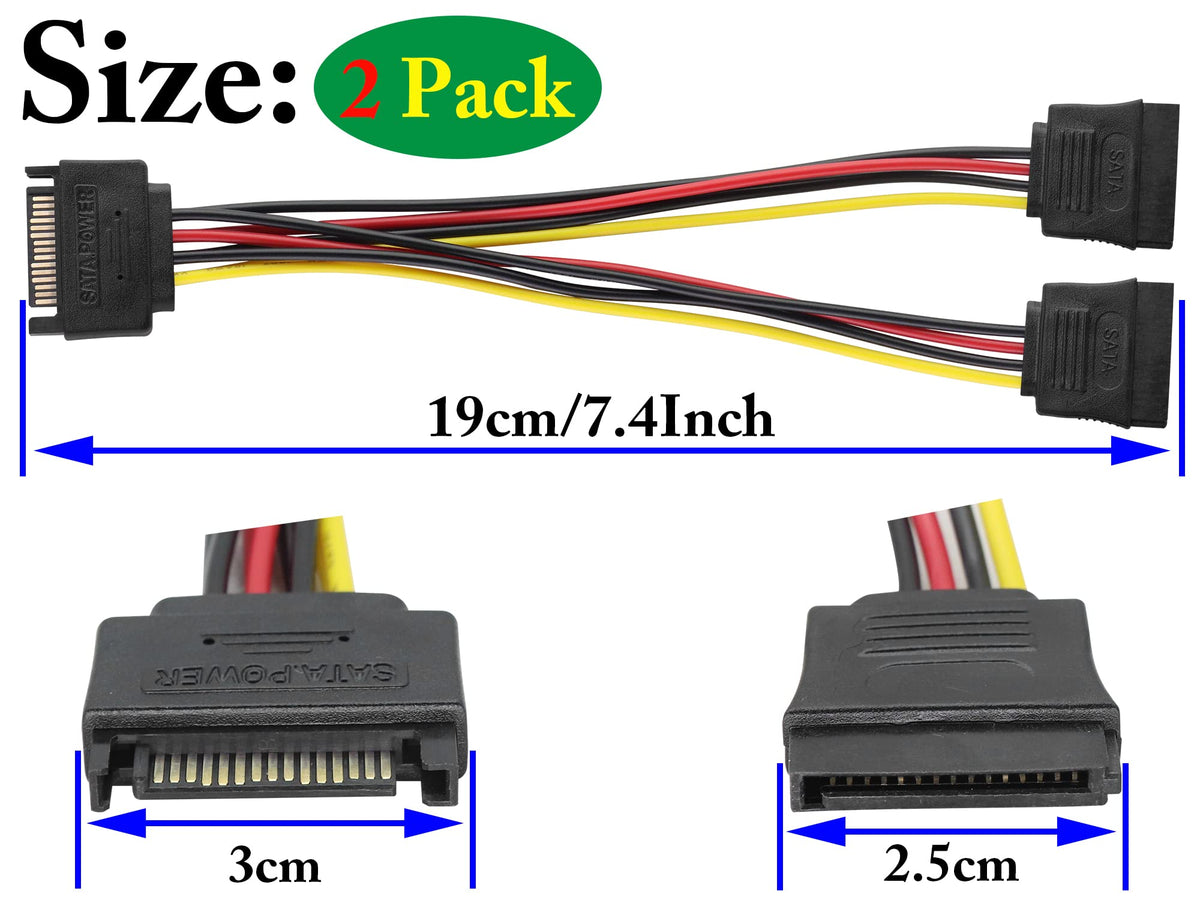 15 Pin Sata Power Adapter Cable One To Twoconnector 1: Sata 15 Pin Male.Connector 2:2 X Sata 15 Pin Female.Length: 19 Cm/7.4 Inches.18Awg Wire Gaugewhen The Sata Power Port Is Not Enough, You Can Convert One Sata Power Port Into Two Sata Power Ports.One Power Input, Two Power Output Interfaces.It Can Simultaneously Power Two Hard Drives Or Optical Drives.Provides Stable Power Protection For Large Capacity Hard Drives.High Quality Oxygen-Free Copper Core, Environmentally Friendly, Stable Work And Fast Transmission Speed.Elastic Pvc Jacket, Flexible And Smooth, Resistant To Bending/Abrasion, Durable.Package Contents:2 * Sata 15 Pin 1 Male To 2 Female Power Extension Cablenote: Please Check The Device Interface Before Purchasing.