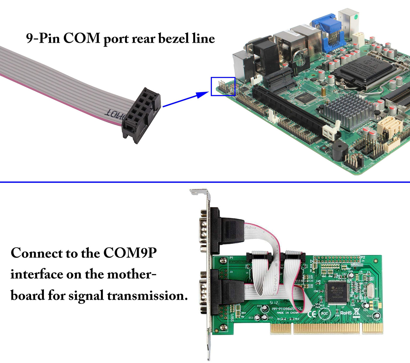 Q: How does the DB9 to 10 pin header ribbon cable connector work?A: The DB9 to 10 pin header ribbon cable connector allows you to connect two DB9 (Male) serial ports to a 10 pin (2x5) IDC (Female) connector, enabling easy access to additional serial ports via a motherboard expansion slot.