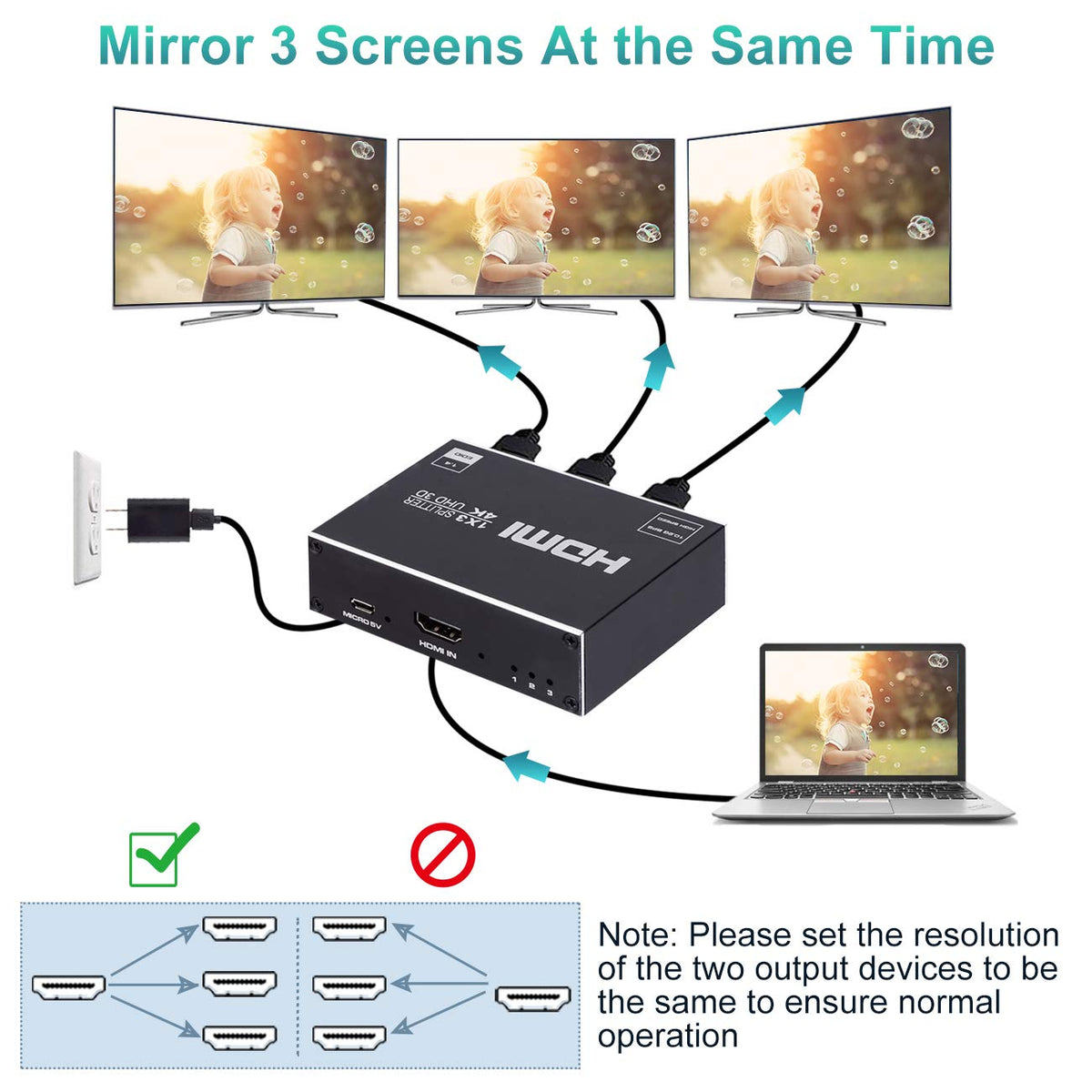 Note 1. The Hdmi Splitter Is Not Support Arc Function. 2. This 1X3 Hdmi Splitter Just Mirror The Screen,Not Support Extend, Each Screen Will Not Show A Difference Page. 3. Hdmi Splitter Distributes The Picture According To The Lowest Resolution Standard.