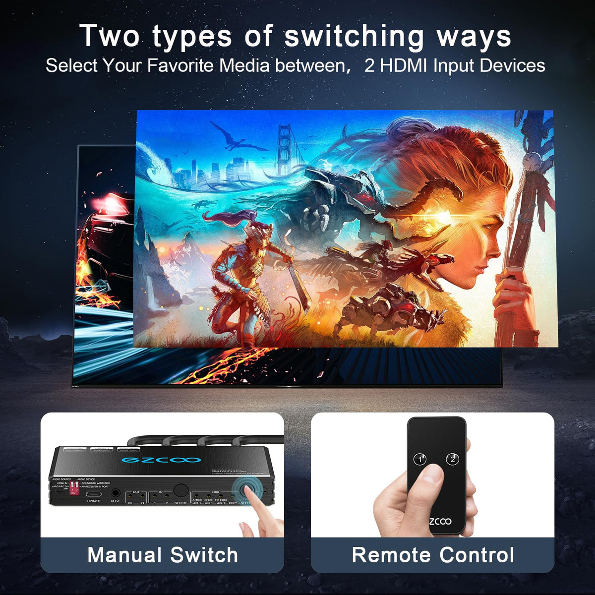 Hdmi 2.1 Switch 2 In 1 Out Easily Shares Video And Audio From 2 Different Hdmi Sources With 1 Hdmi Display 1Hdmi Port (Only Audio)And 1 Optical Toslink Spdif 5.1Ch Audio Device. Supports Ir Remote Control Switch And Cec,Also Can Use For S Onos Arc/Earc,Or Tv Arc/Earc,Or Hdmi2.1/Hdmi2.0 Av Receiver.