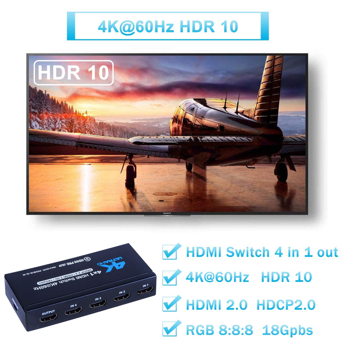 4K Hdmi Switch 4X1, 4K@60Hz 4 In 1 Out Hdmi Switcher Selector With Ir Remote Control, Supports Hdcp 2.2 4K@60Hz Ultrahd Hdr10 3D