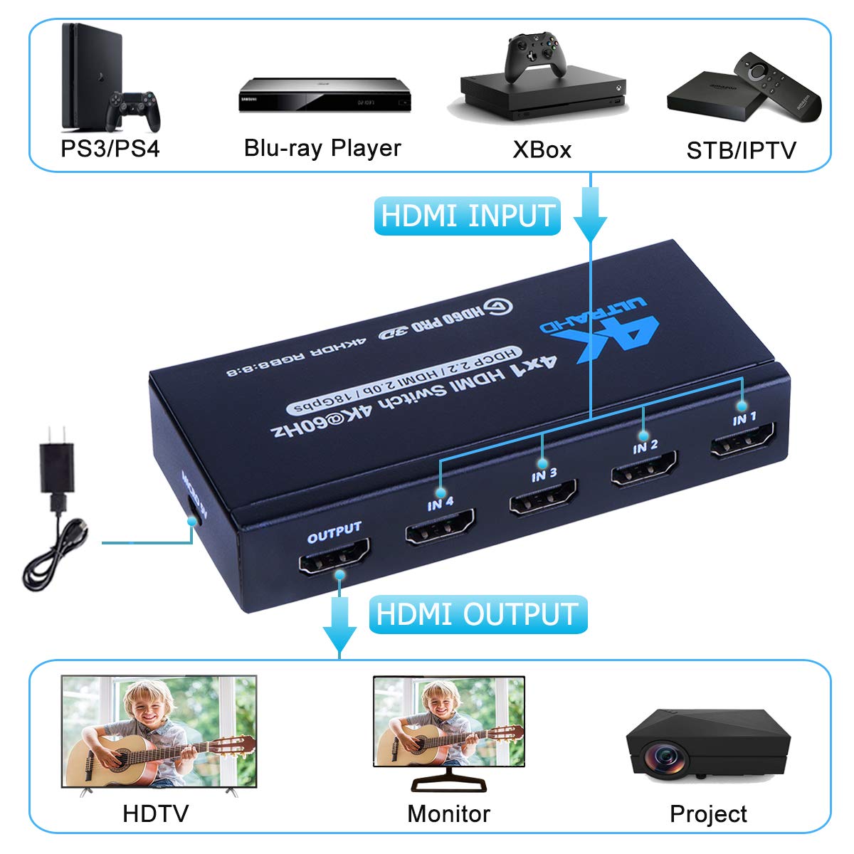 4K Hdmi Switch 4X1, 4K@60Hz 4 In 1 Out Hdmi Switcher Selector With Ir Remote Control, Supports Hdcp 2.2 4K@60Hz Ultrahd Hdr10 3D Hd1080P Dolby Dst, Hdmi Splitter For Ps4 Xbox Apple Tv Fire Stick This Hdmi Switch Supports 4 Hdmi Inputs To 1 Hdmi Output With A Ir Wireless Remote Control Or A Local Select Button, Allowing You Enjoy Your Perfect Hdtv Picture. . Product Features: 1.Support Compressed Audio; Dts Digital, Dolby Digital (Dts-Hd And Dolby) 2.Support High-Resolution Input: 480P/ 576P/ 720P/ 1080P/ 1080P 3D/ 4K@60Hz, Hdmi V2.0, Hdcp V1.4, Hdr 4K*2K 3.Compatible With Hdtv Which Support Hdmi And Hdcp 4.Each Port Supports Hdmi Protocol Input 5.Support Video Transmission: 18Gbps/ 1536Mhz 6.Support High-Definition Signal With Remote Control 7.Support Automatic Identification Of The Signal Source 8.Support Automatically Jumps To The Newly Inserted Hdmi Source Product Specifications: Input Port: 4 X Hdmi Input Output Port:1 X Hdmi Output Input Power Port: Dc 5V/1A Power Port Led Indicator: 1 Power Led Indicator, 4 Hdmi Select Indicator, 1 Ir Indicator Color: Black Package Includes: 1 X Hdmi Switch 1 X Ir Remote Control 1 X Power Adapter 1 X Uuse Manual