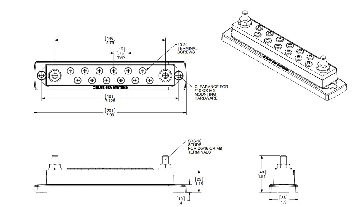 250A Maxibus Busbar With 12 Screws (Part Number 2105). Max Voltage: 300V Ac/ 48V Dc, Continuous Rating: 250A Ac/Dc. Terminal Screws: 12 X #10-24, Terminal Studs: 2 X 5/16''-18. Ul 94-V0 Rated Base Material Resists High Heat, Tin Plated Pure Electrical Copper For Maximum Conductivity And Corrision Resistance. 2 Mounting Holes Accept #10 (M5) Screws.