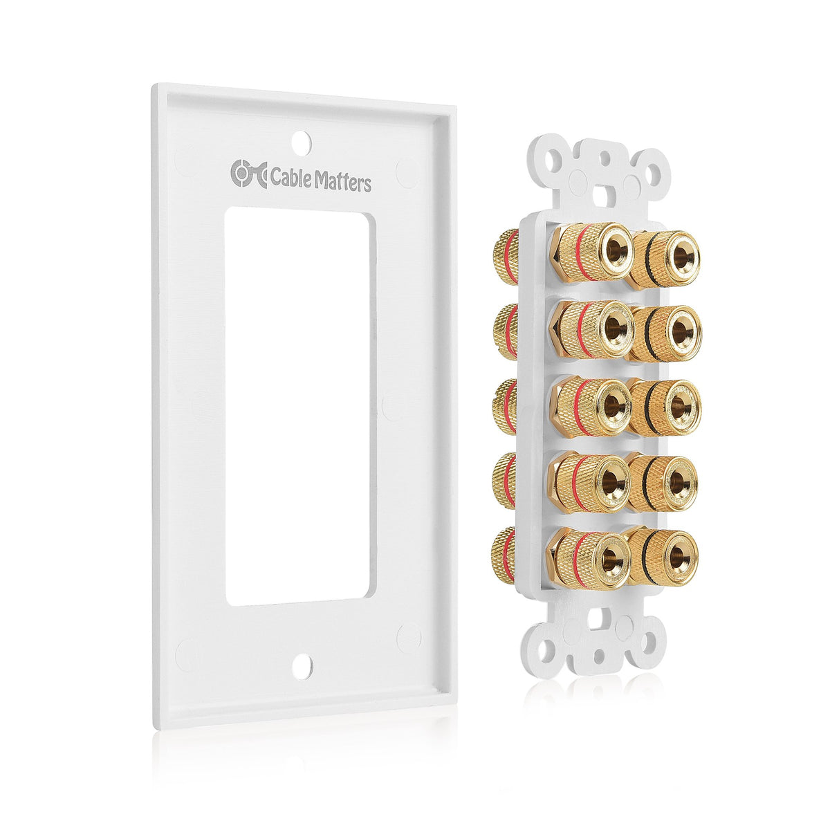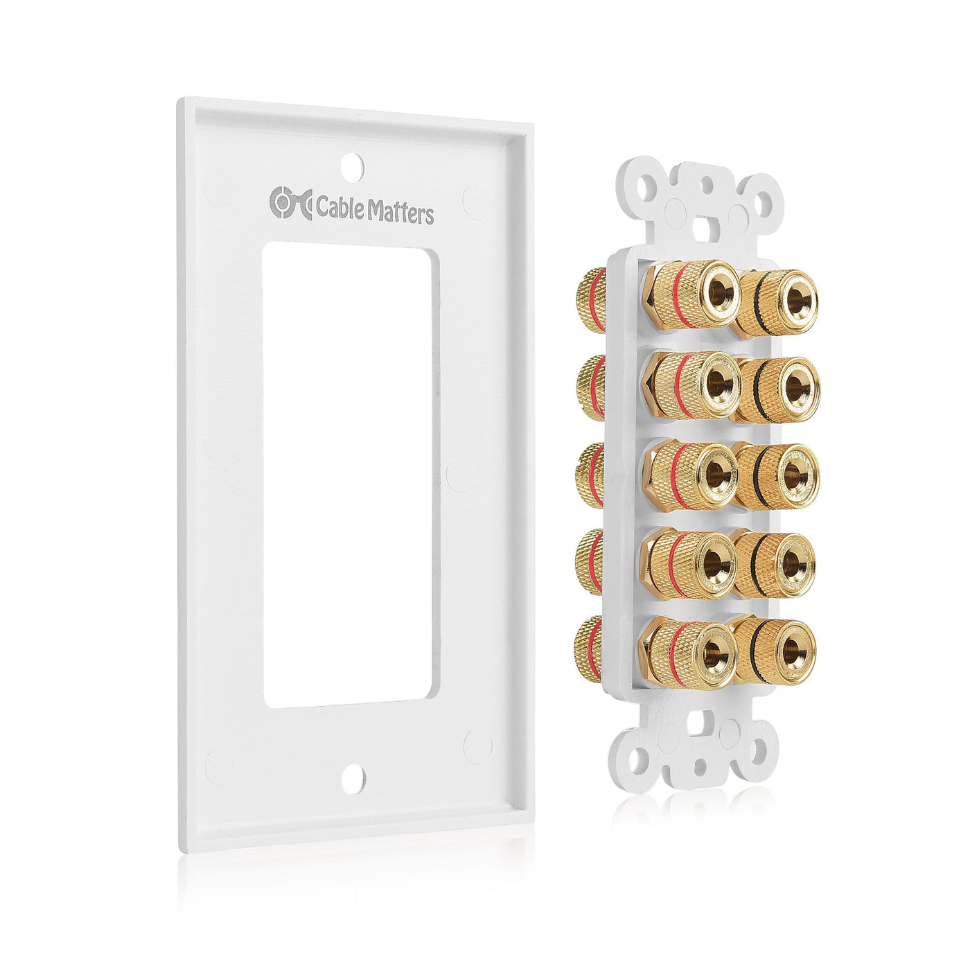 Connect More With Cable Matters A/V Products Audio Arrangement The Cable Matters Banana Jack Binding Post Wall Plate For 5 Speakers Provides A Simple Way To Connect Speakers Across The Room Or Down The Wall. Conceal Speaker Wire In The Wall Instead Of Fastening It To The Baseboard For A Secure And Professional-Looking Installation. Connect With 12 To 18 Awg Bare Speaker Wire, Banana Plugs, Or Spade Connectors. The Two-Piece Faceplate With Insert Is Easy To Install With The Included Mounting Screws.Cost-Effective 2-Pack With A Lifetime Warranty These Sturdy Wall Plates Are Built To Last With Gold-Plated Terminals Labeled Red And Black. This Cost-Effective 2-Pack Connects 10 Speakers And Includes A Lifetime Warranty For Peace Of Mind When Purchasing.Important Note - Some Models Of Banana Plug Connectors May Not Fit When Used On Both Sides Due To The Length Of The Terminals. Installation Tips (In The Most Common Wall Boxes) 1) Connect The Speaker Wire To The Rear Of The Binding Posts In The Insert 2) Using The Small Length Screws - Fasten The Main Piece To The Faceplate 3) Fasten The Assembled Wall Plate To The Box Or Bracket 4) Connect The Speaker Wire To The Front Binding Post Terminals Package Contents 2 X Banana Jack Binding Post Inserts For 5 Speakers 2 X Single-Gang Faceplate 8 X Mounting Screws Warranty Limited Life Warranty And Product Support