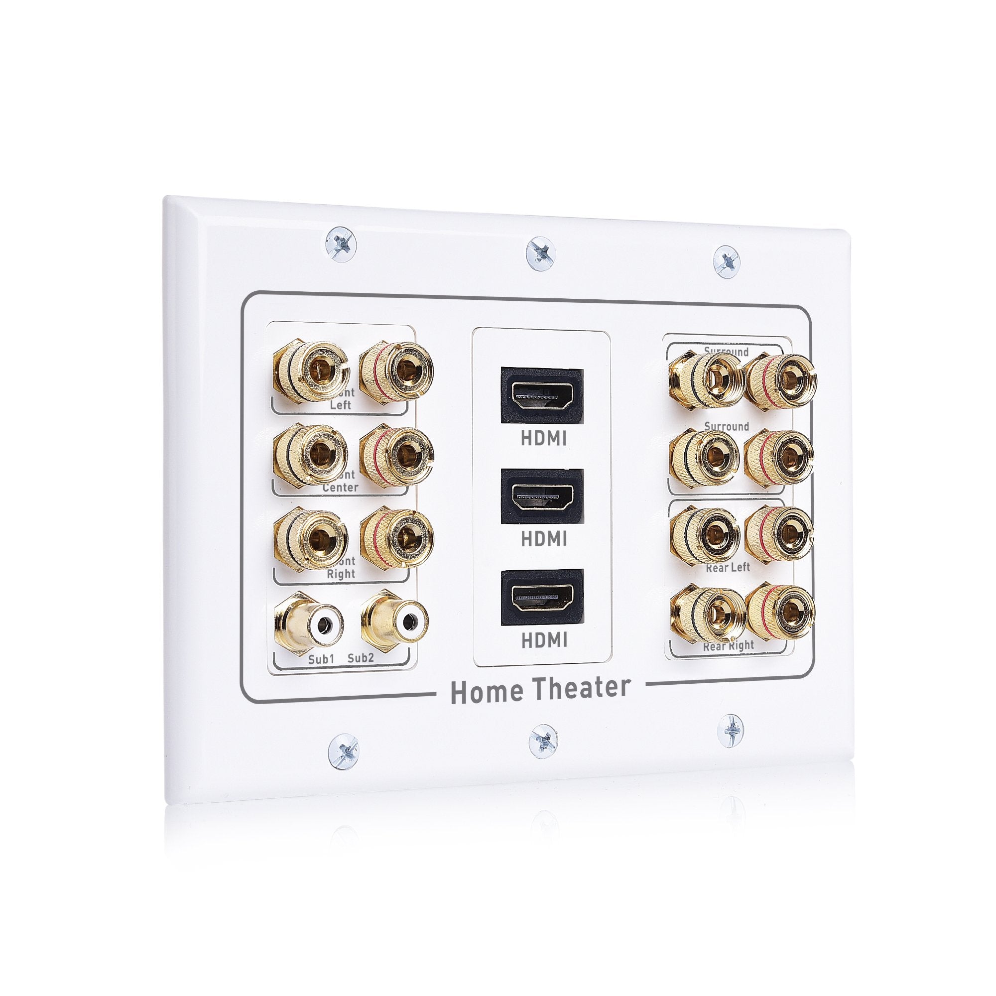 The Cable Matters Double-Gang 7.2 Surround Sound Distribution Wall Plate with 3x HDMI connects 7 speakers, 2 subwoofers and three devices with HDMI in a 7.2 Surround Sound system. Conceal the wires from your home theater system in the wall instead of fastening them to the baseboard for a secure and professional-looking installation. Connect the binding posts with 12 to 18 AWG bare speaker wire, banana plugs, or spade connectors and two subwoofers with RCA cables. Connect a CATV box, media streamer, and gaming console to your UHD TV with HDMI.