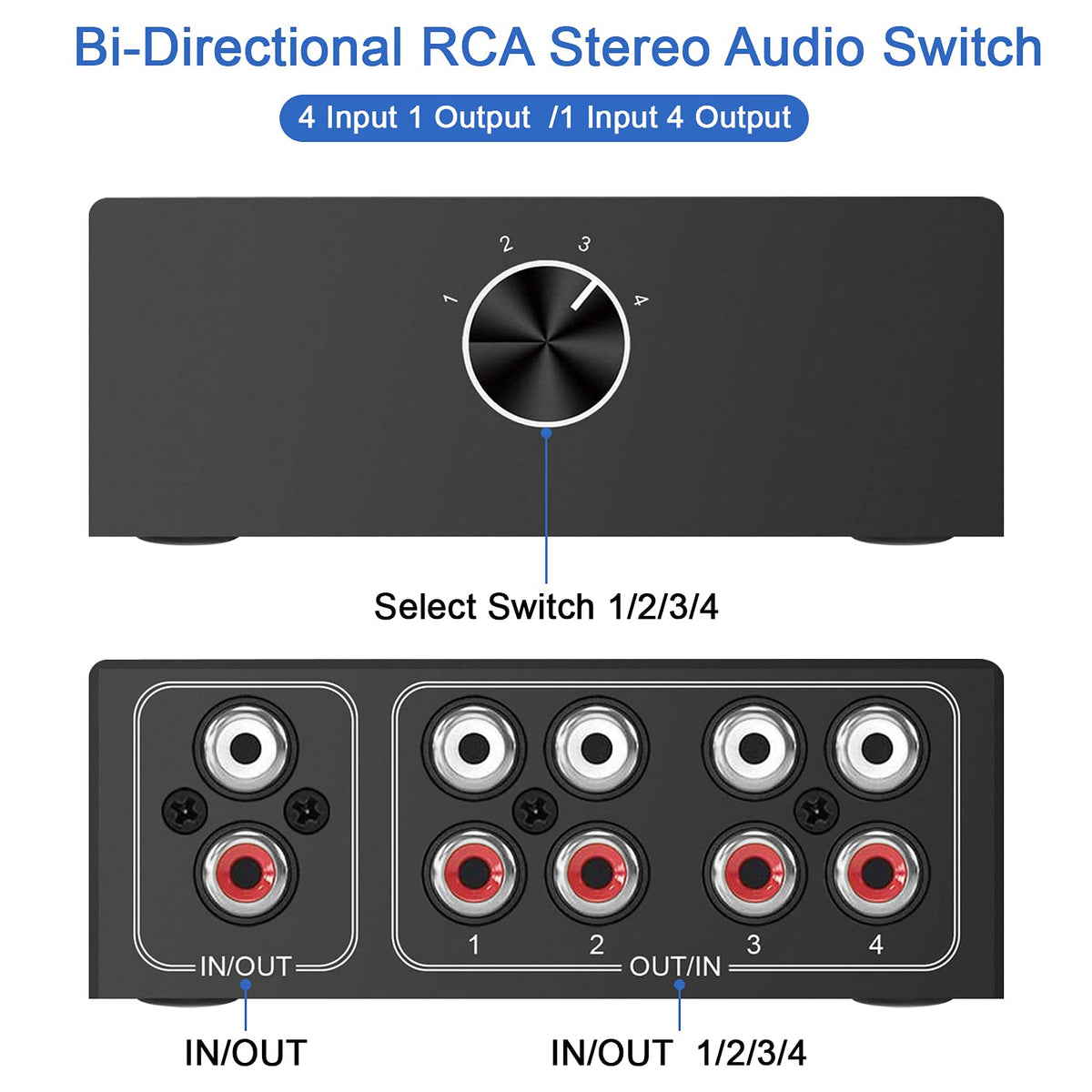 Q: How do I set up the RCA audio switcher?A: Setting up the Dingsun RCA audio switcher is simple. Connect the RCA output cables from your audio devices to the RCA input ports on the switcher. Then, use the front panel knob to select your desired input or output. The unit supports both 4 input 1 output and 1 input 4 output configurations.