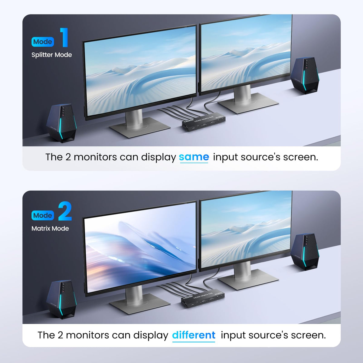 The Hdmi 2.0 Matrix 4X2 Can Connect 4Hd Signal Source To 2 Hd Display Devices With Optical Fiber Or Stereo Headphone Output. Support Matrix Mode Or Splitter Mode, Which Means The Support 4 Hdmi Input Source To Be Switched Or Split To 2 Hdmi Monitors. Any Output Ports Can Out Independent Audio By Optical Or 3.5 Mm Stereo Port. Features: Support 3D Video Formatsupport 4K Input Resolution Output 2K Resolution (Auto Down Scaler) Support Output 2 Different Audio By 3.5 Mm Jack Port And Optical Port At The Same Timesupport Lpcm/Dol-By/Dts 5.1 Channel