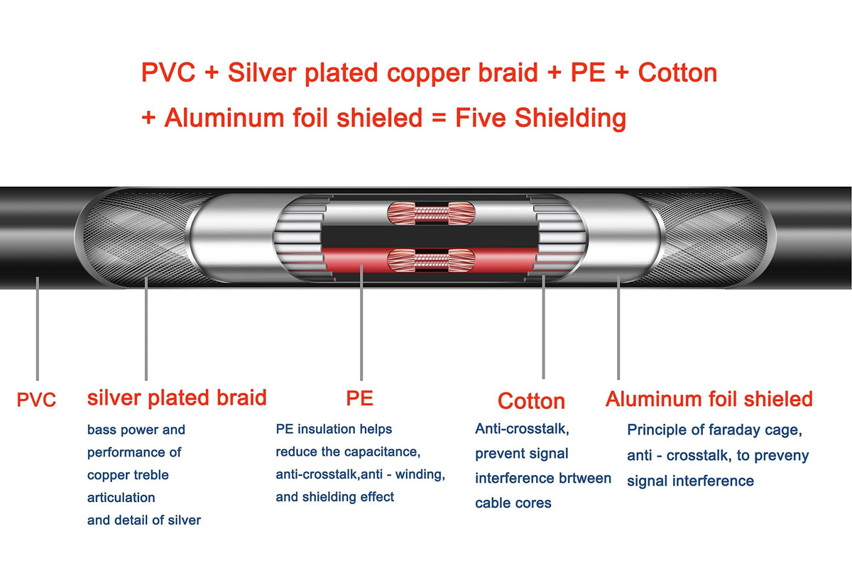 Q: What materials are used in the construction of this cable?A: This cable is made with high-quality materials including 2x24 AWG wires, braided nickel plating, and a four-layer shielding system for optimal conductivity and noise cancellation.