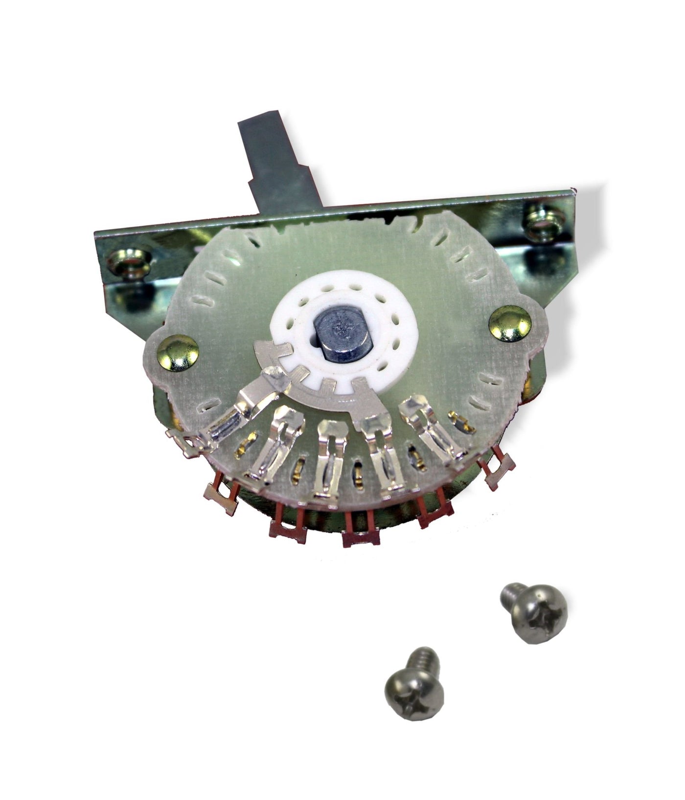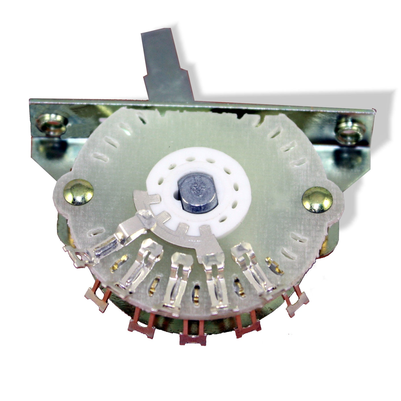 Guitar Switch, 4 Way, Oak Grigsby Bulk Single Specifications: 4 Way Lever Switch No Knob Lever Rotary Switch 10 Total Pins: 2 Common Pins (Solder Type) 4 Variable Pins Off Each Common (Solder Type) Requires Body Cavity Depth Of 1 7/16 Switch Is 17/32 Wide By 1 7/8 Long Mounting Plate Is 25/64 X 1 7/8 With Screw Mounting Holes 1 5/8 On Center. Includes Stainless Steel Pan Head Mounting Screws Direct Replacement For Many Oem Style Switches. (Please Check Hole Span, Requires 1 5/8 Center To Center) Manufacture: Oak Grigsby, Electroswitch # 51973