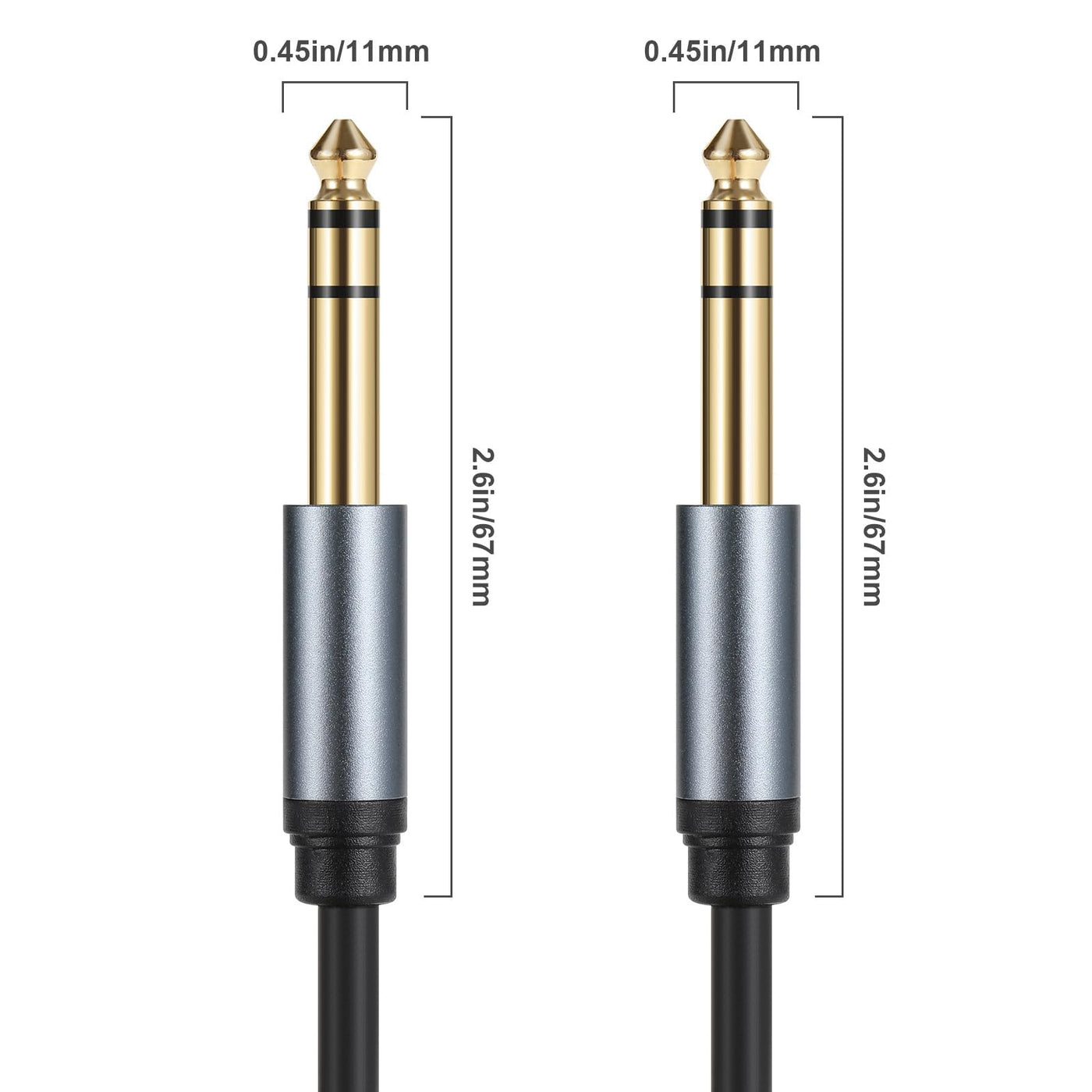 Q: What does the golden plated design of the audio jack do?A: The golden plated design of the 1/4 inch male to male TRS audio jack enhances connectivity by reducing signal loss and improving audio quality, providing a clearer sound for your instruments and equipment.