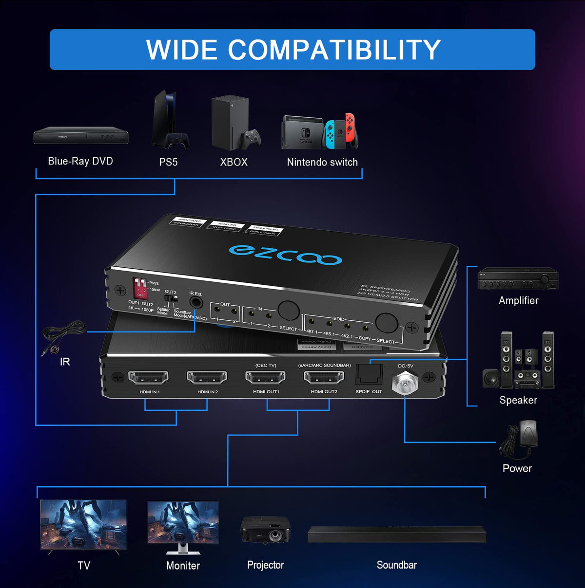 Intro Ez-Sp22H2Earco Ezcoo Hdmi Splitter 1 In 2 Out With Audio Out, 4K 60Hz 4:4:4 18Gbps 8Bit Hdr D-O-L-B-Y Vision Hdcp2.2, D-O-L-B-Y Atmos, Cec On Output 1 Only;Supports 4K Hdr Tv & 1080P Capture Card Work In Sync; D-O-L-B-Y Vision D-O-L-B-Y Atmos Work In Sync. Edid Dip Switch: 4K7.1: 4K@60Hz_4:4:4_D-O-L-B-Y Vision_Atoms_7.1Ch_3D_Hdr4K5.1: 4K@60Hz_4:4:4_D-O-L-B-Y Vision_5.1Ch_3D_Hdr4K2.1: 4K@60Hz_4:4:4_D-O-L-B-Y Vision_2.1Ch_3D_Hdrcopy: Learn Edid From Hdmi Out 1Spdif 5.1Ch Audio Extractor Breakoutpls Use New Hdmi2.0 Awg26 Cable Less Than 3 Meter.