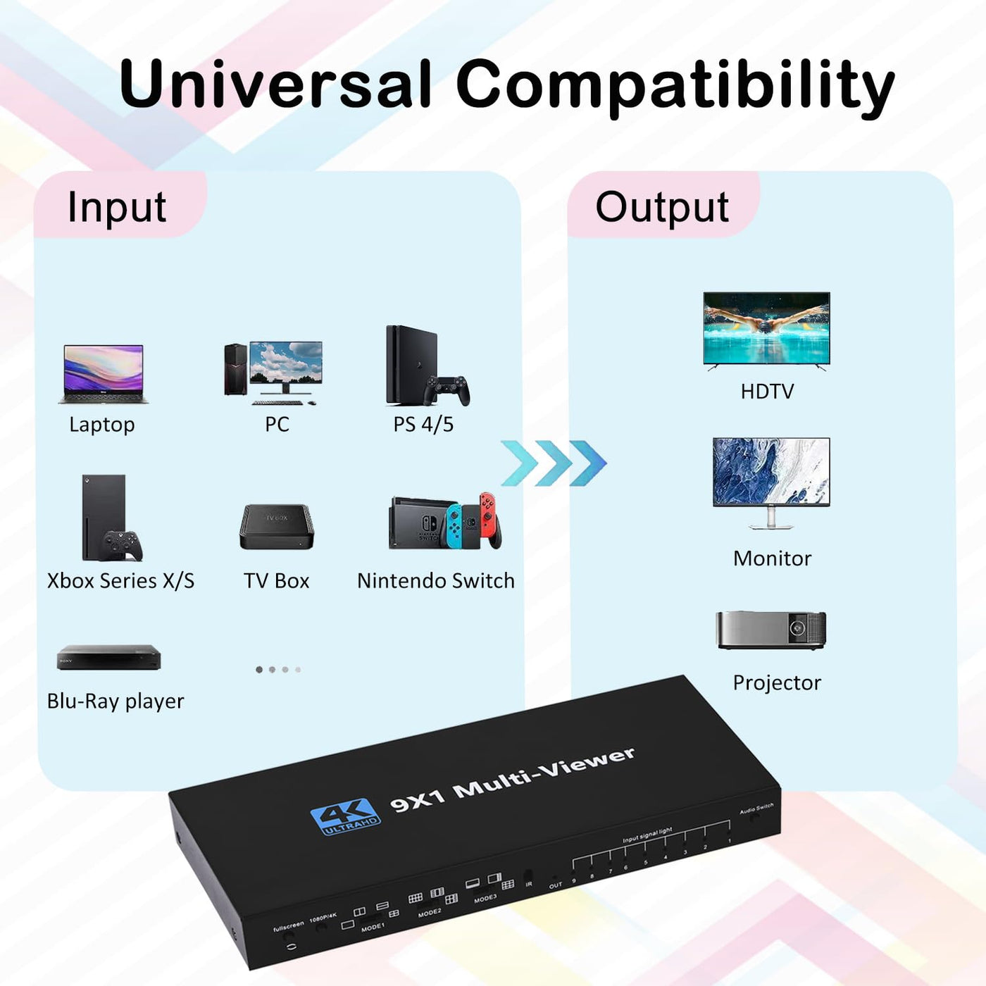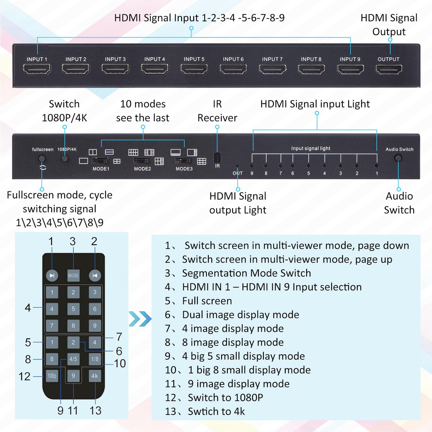 Hdmi Multiviewer Switch 9X1, Seamless Hdmi Quad Multiviewer Switcher 9 In 1 Out With Ir Remote Control, Support 1080P@60Hz And 1