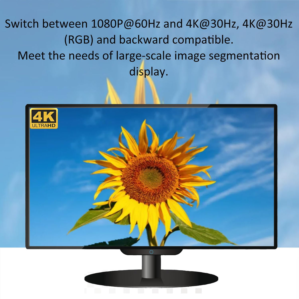 Product Features Support 9 Hdmi Input, 1 Hdmi Output. Support 9 Hdmi Signal Screen Segmentation. Support 9 Hdmi Signal Seamless Switching. Switch Between 1080P/60Hz And Backward Compatible. Support Hdmi1.4, Hdcp1.4 And Backward Compatible. Hdmi Input And Output Transmission Distance:High Speed Hdmi Cable Can Reach Up To 15M.(Hdmi Cable 19+1,28Aw). Support Ir Control. Power Supply: Dc5V2A. Specifications Support Hdmi Resolution: 1080P/ 1080I/ 720P/ 576P/ 576I/ 480P/ 480I Support Video Color Format:24Bit/ 30Bit/ 36Bit. Support Audio Input Format:Dts-Hd/ Dolby-Real Hd/ Dolby-Ac3/ Dsd Support Audio Output Format: Lpcm, Pcm2 Max Bandwidth: 330Mhz; Max Bandrate:10.2Gbps Input/Output Tmds Signal:0.5~1.5V P-P (Ttl) Input/Output Ddc Signal:5 Volts P-P (Ttl) Input Cable Distance:=15Mawg24 Hdmi Standard Cable Output Cable Distance:=24Mawg24 Hdmi Standard Cable Max Working Current:5V/ 0.6A Operating Temperature Range:(-15~+55C) Operating Humidity Range: 5~90%Rh (No Condensation)) Dimension (L X W X H):148*63*23Mm Weight:206G Notes Please Use The Product According To The Following Instructions To Ensure A Long Service Life. 1?The Product Should Be Placed At The Spot Far From The Damp, High-Temperature, Dusty, Erosive And Oxidative Environment. 2?All Parts Must Not Be Subject To Strong Shake, Hit Or Fall. 3?Please Do Not Open The Cover Or Touch The Inside Parts. Before Power On, Please Check All The Connection Cables And Make Sure All Interfaces Are Connected Well. Package List Hdmi 9X1 Quad Multiviewer X 1 Ir Remote Control X 1 Dc 5V/2A Power Adapter(Type-C Port) X 1 User Manual X 1