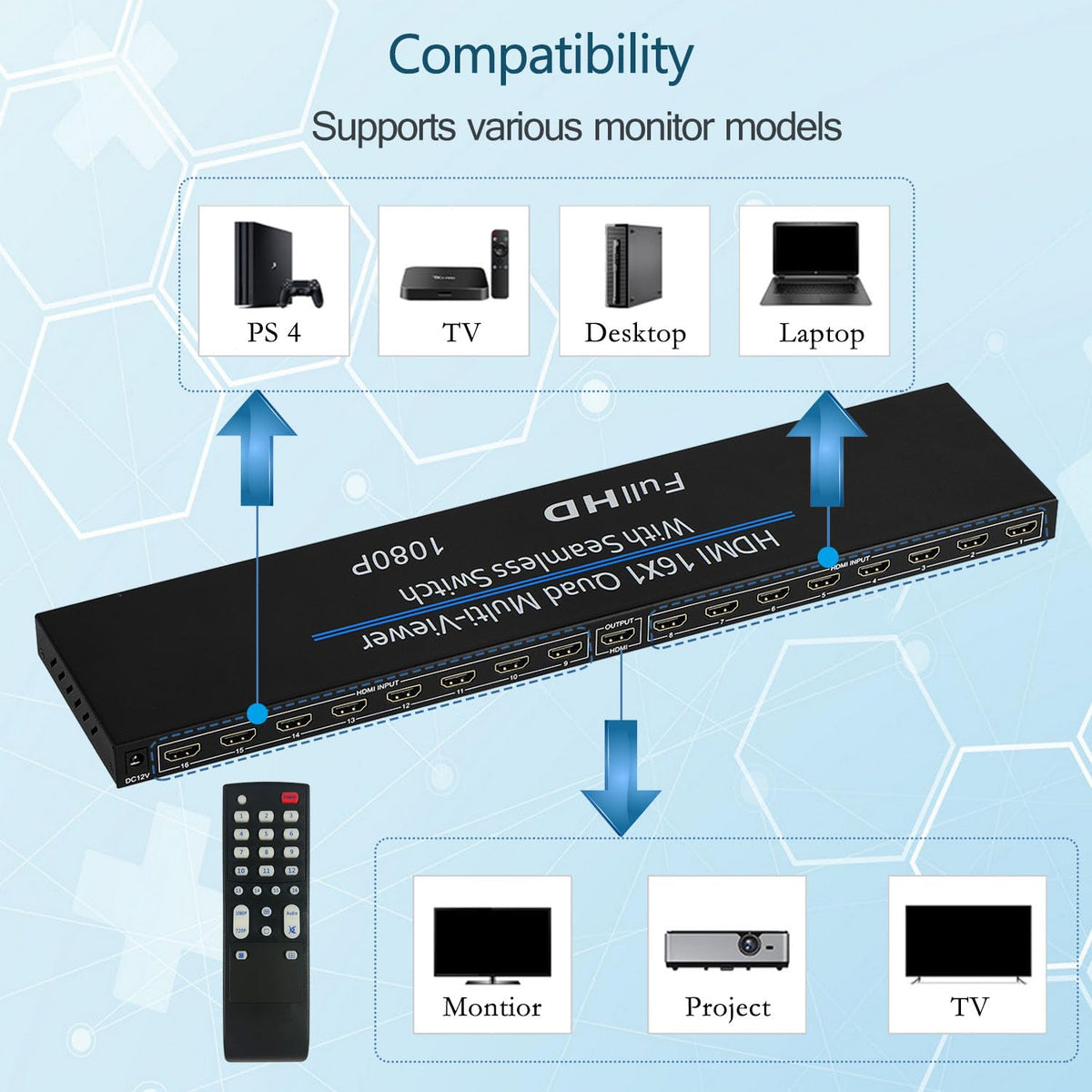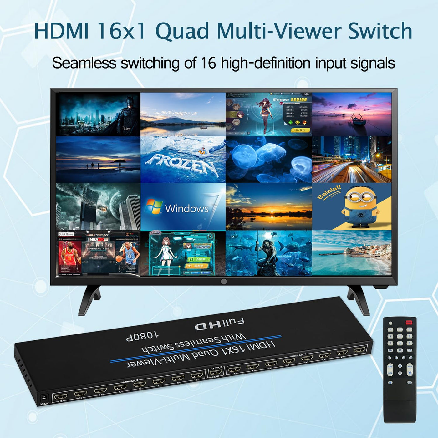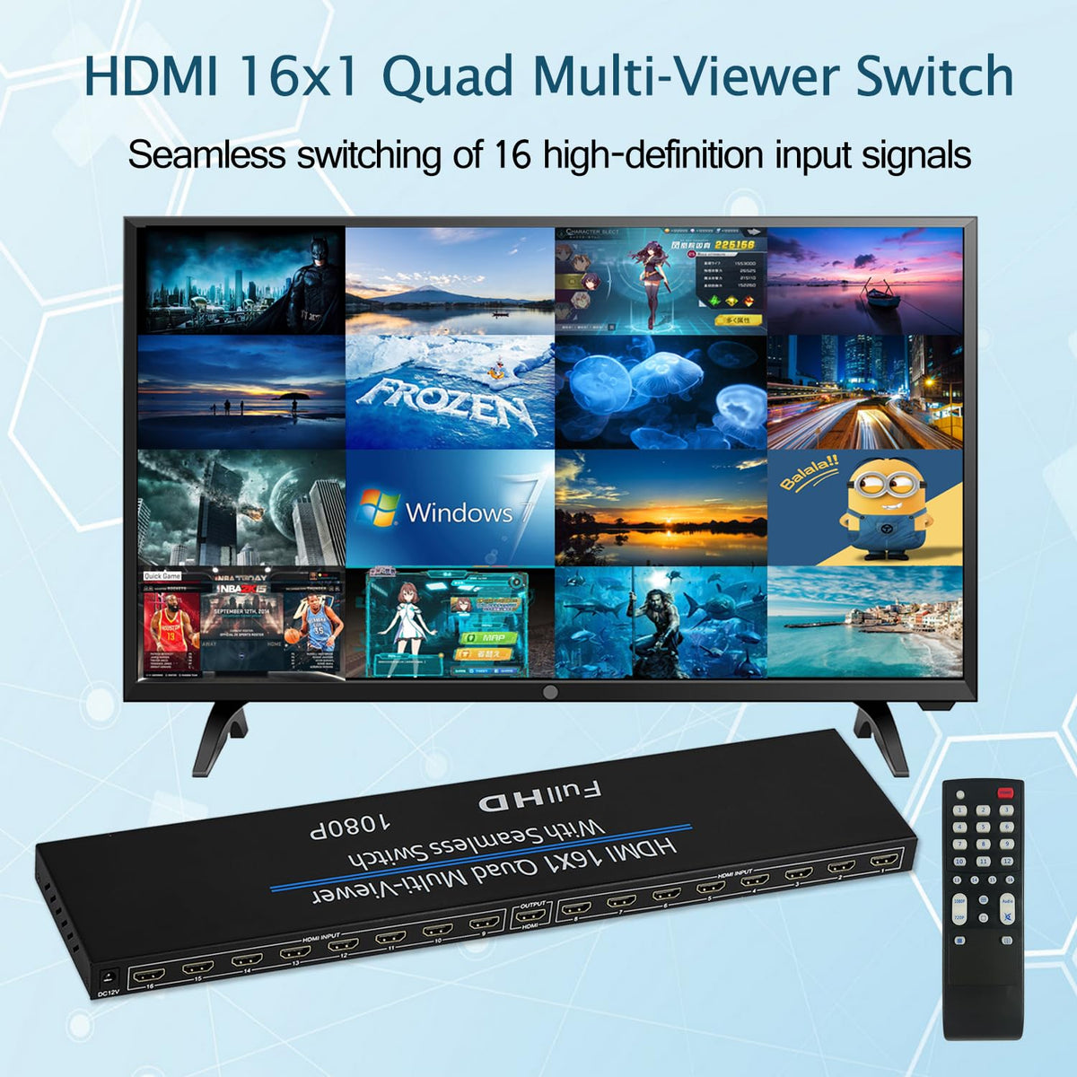 Hdmi Quad Multiviewer 16X1, Seamless Switcher 16 In 1 Out With Ir Remote Control, Support 1080P And 8 Viewing Modes